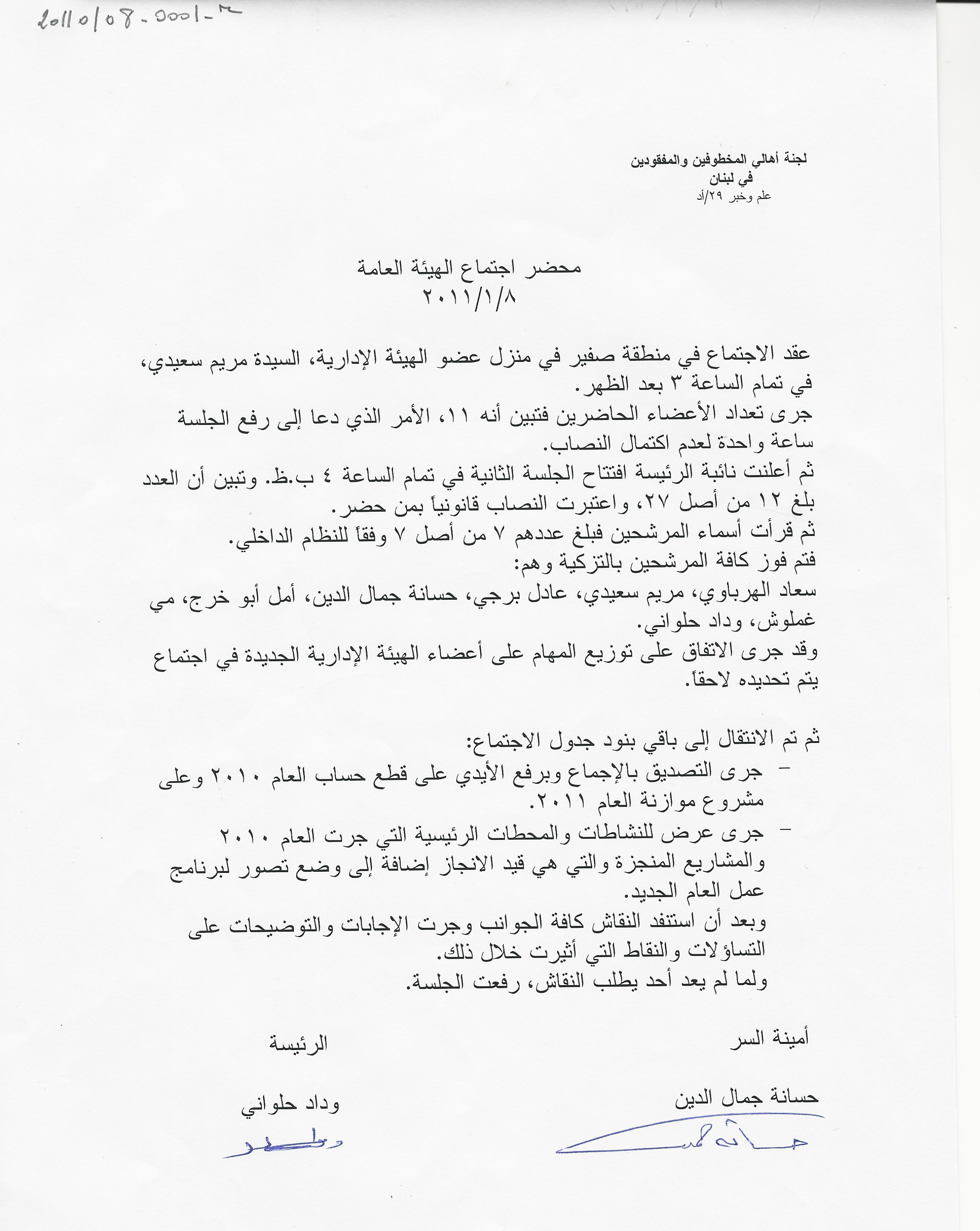 محضر اجتماع الهيئة الادارية للجنة الاهالي :السبت 8، 1، 2011