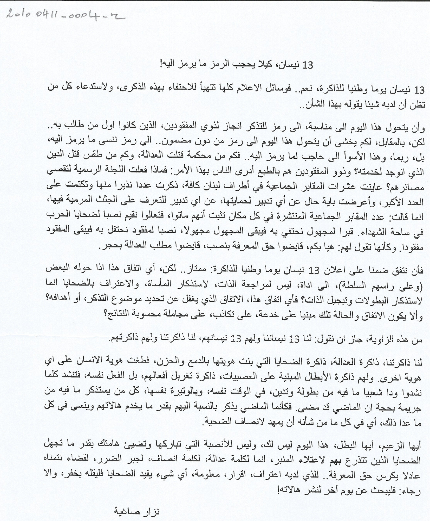 - ar كلمة نزار صاغية بمناسبة 13 نيسان 2010 الذكرى الـ 35 للحرب في لبنان