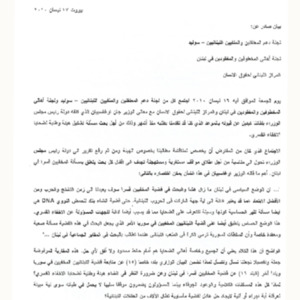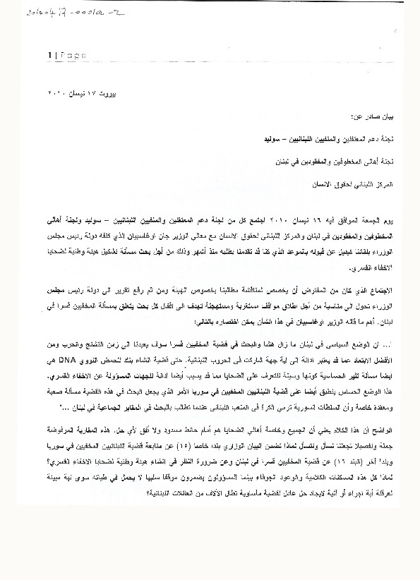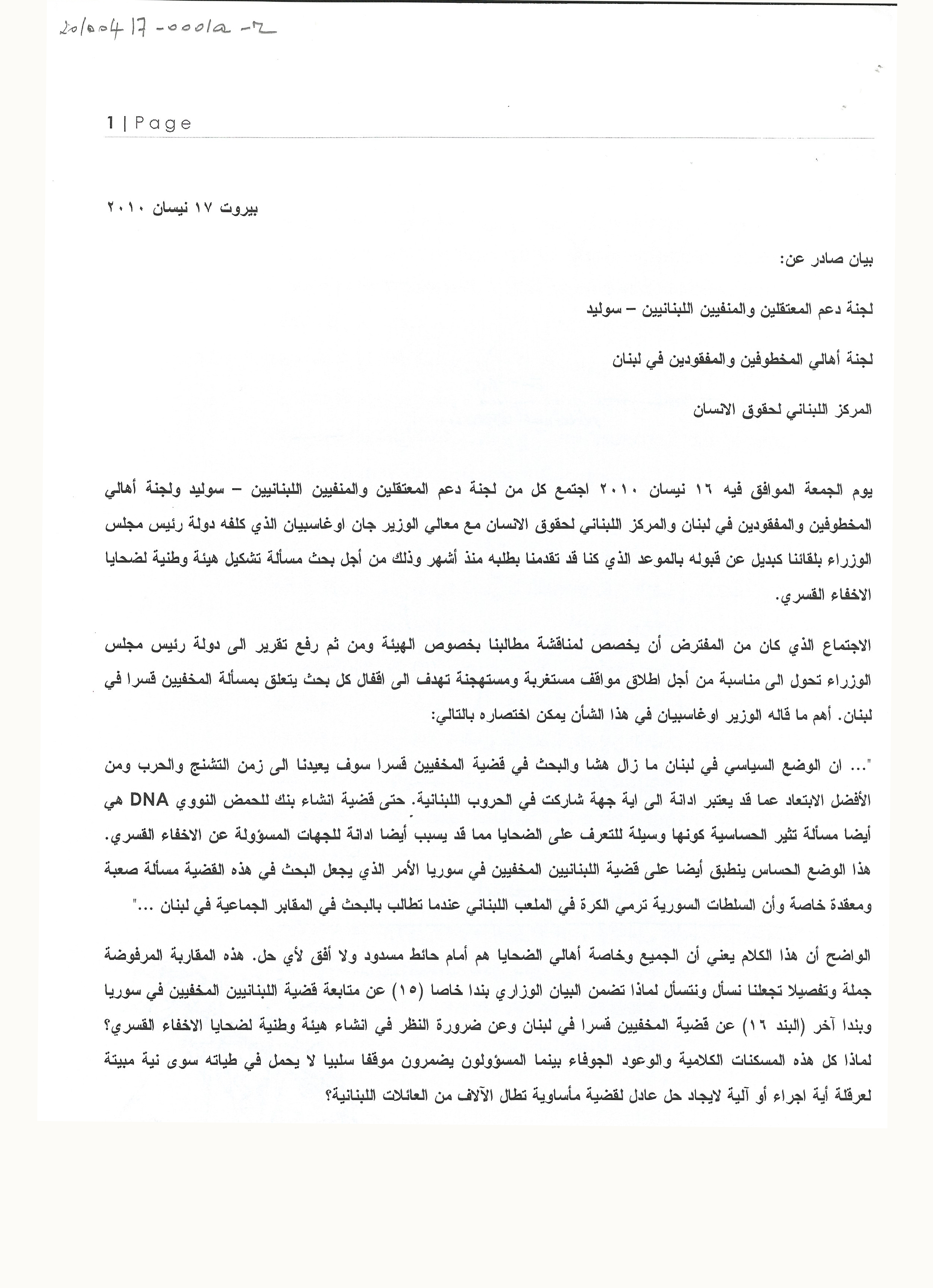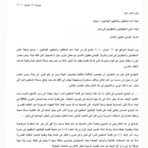 بيان صادر عن لجنة دعم المعتقلين والمنفيين اللبنانيين سوليد، لجنة اهالي المخطوفين والمفقودين في لبنان، المركز اللبناني لحقوق الانسان