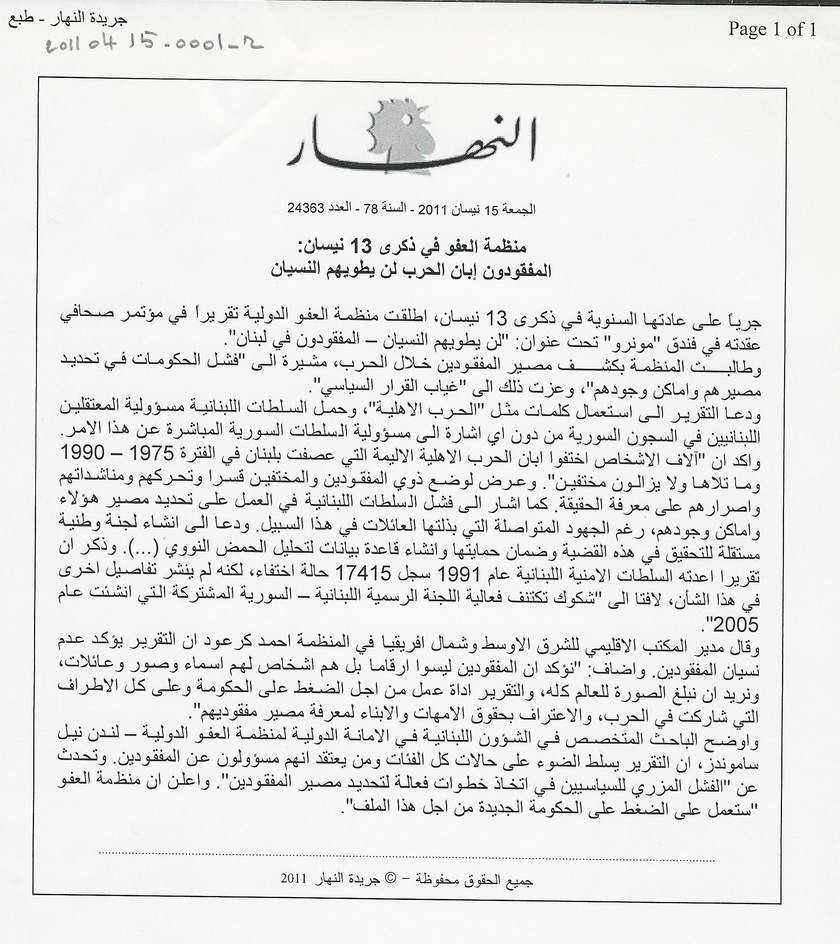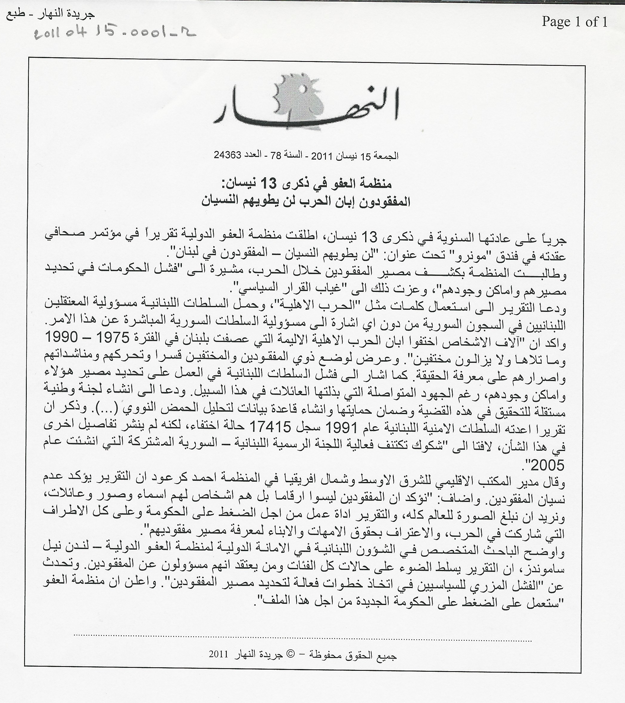 - en Amnesty International on the anniversary of April 13: Will not be forgotten: Lebanon’s missing persons.