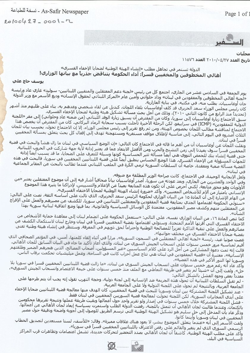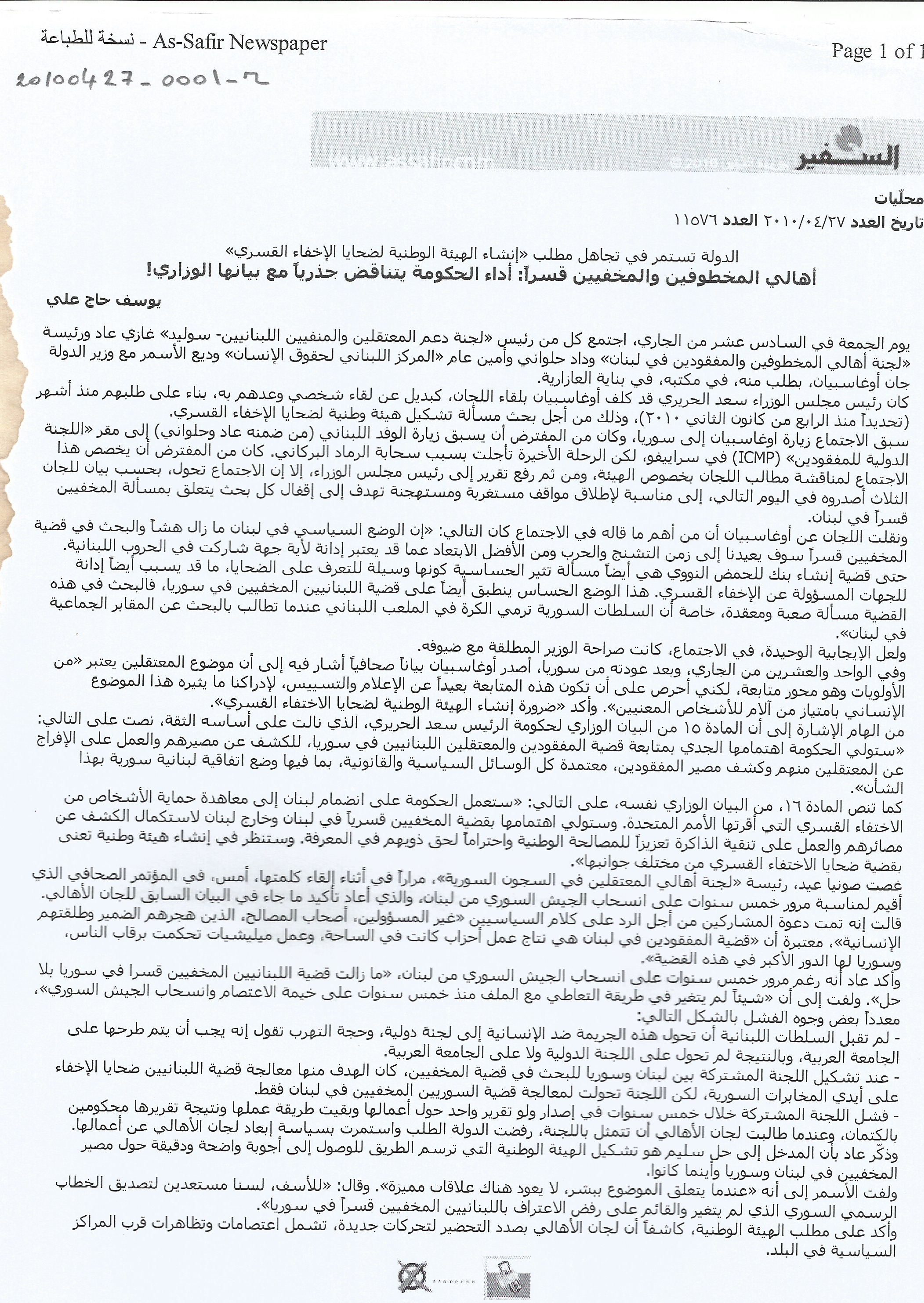 الدولة تستمر في تجاهل مطلب انشاء الهيئة الوطنية لضحايا الاخفاء القسري، اهالي المخطوفين والمخفيين قسرا: اداء الحكومة يتناقض جذريا مع بيانها الوزاري