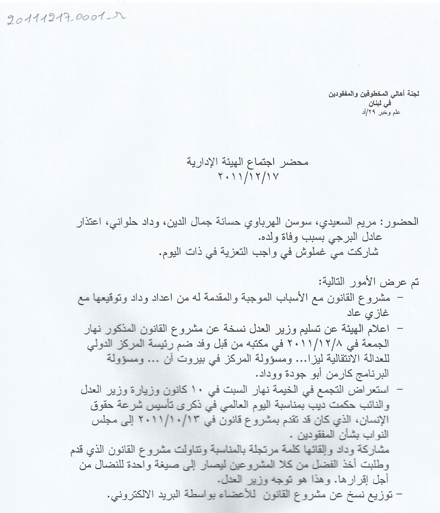 - ar محضر اجتماع الهيئة الادارية للجنة الاهالي :السبت، 17، 12، 2011