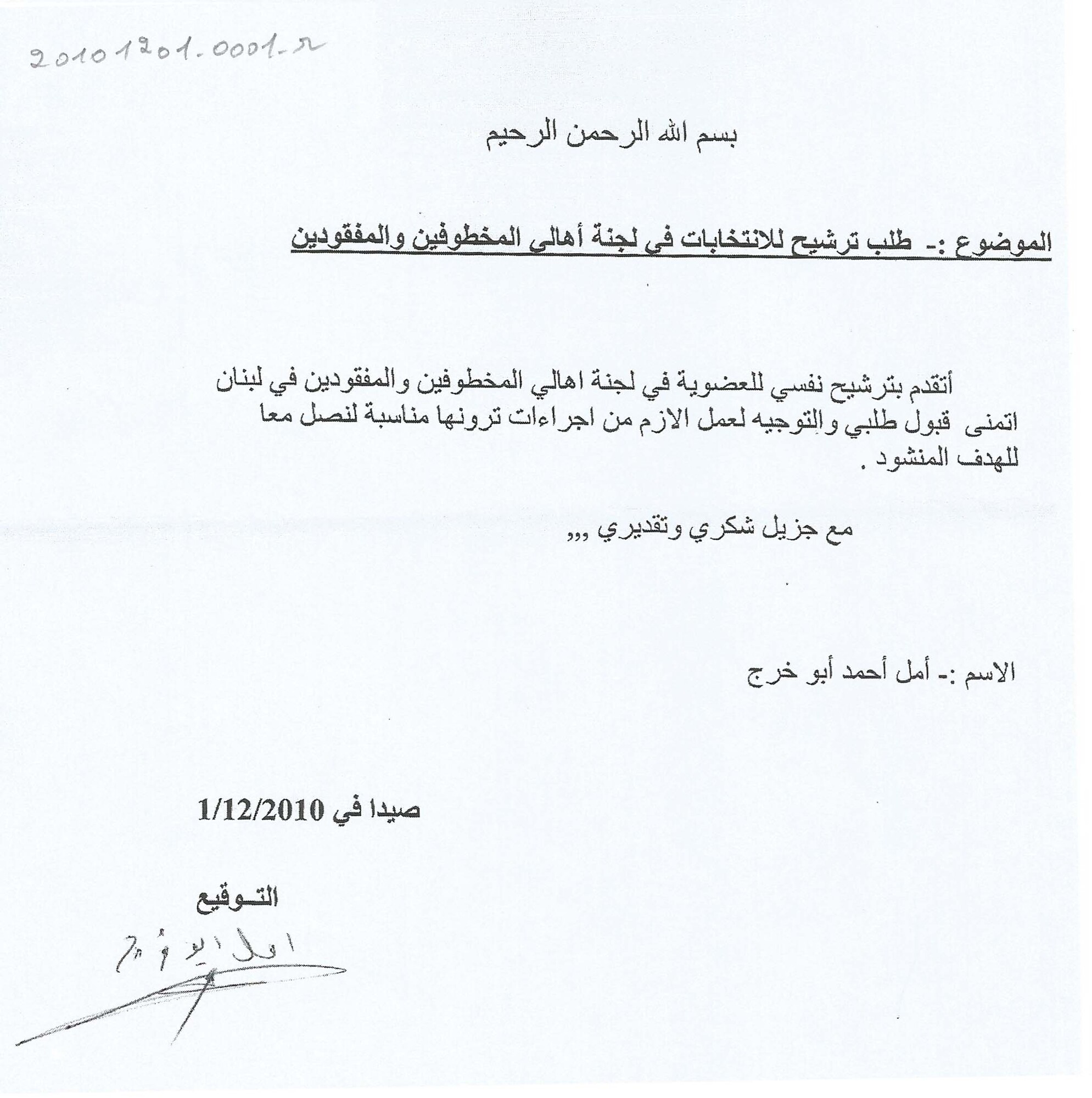 طلب ترشيح للانتخابات في لجنة اهالي المخطوفين والمفقودين