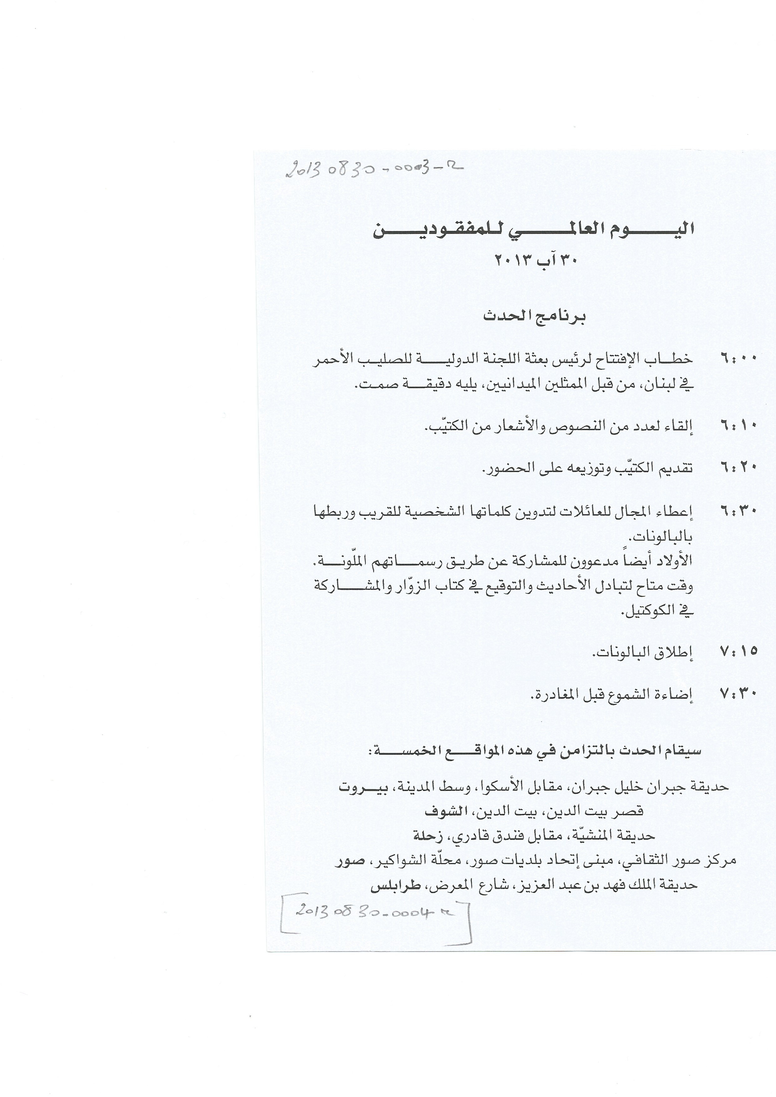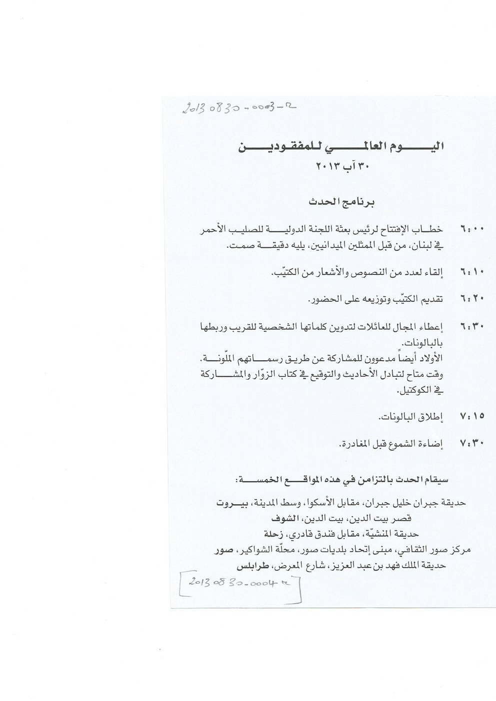 اليوم العالمي للمفقودين، 30 آب، 2013: برنامج الحدث