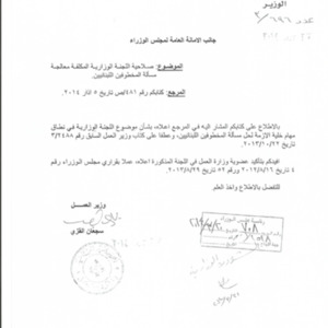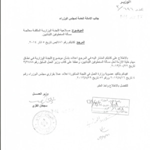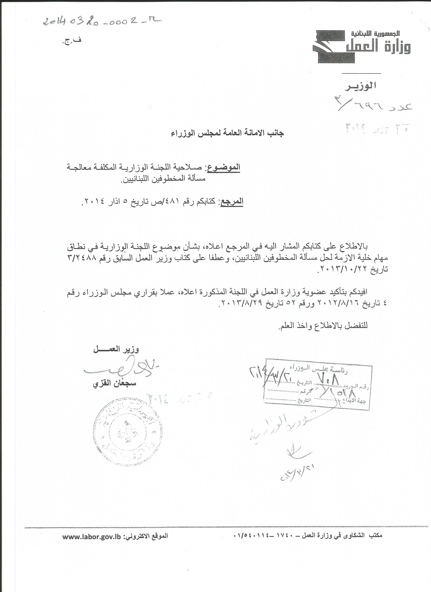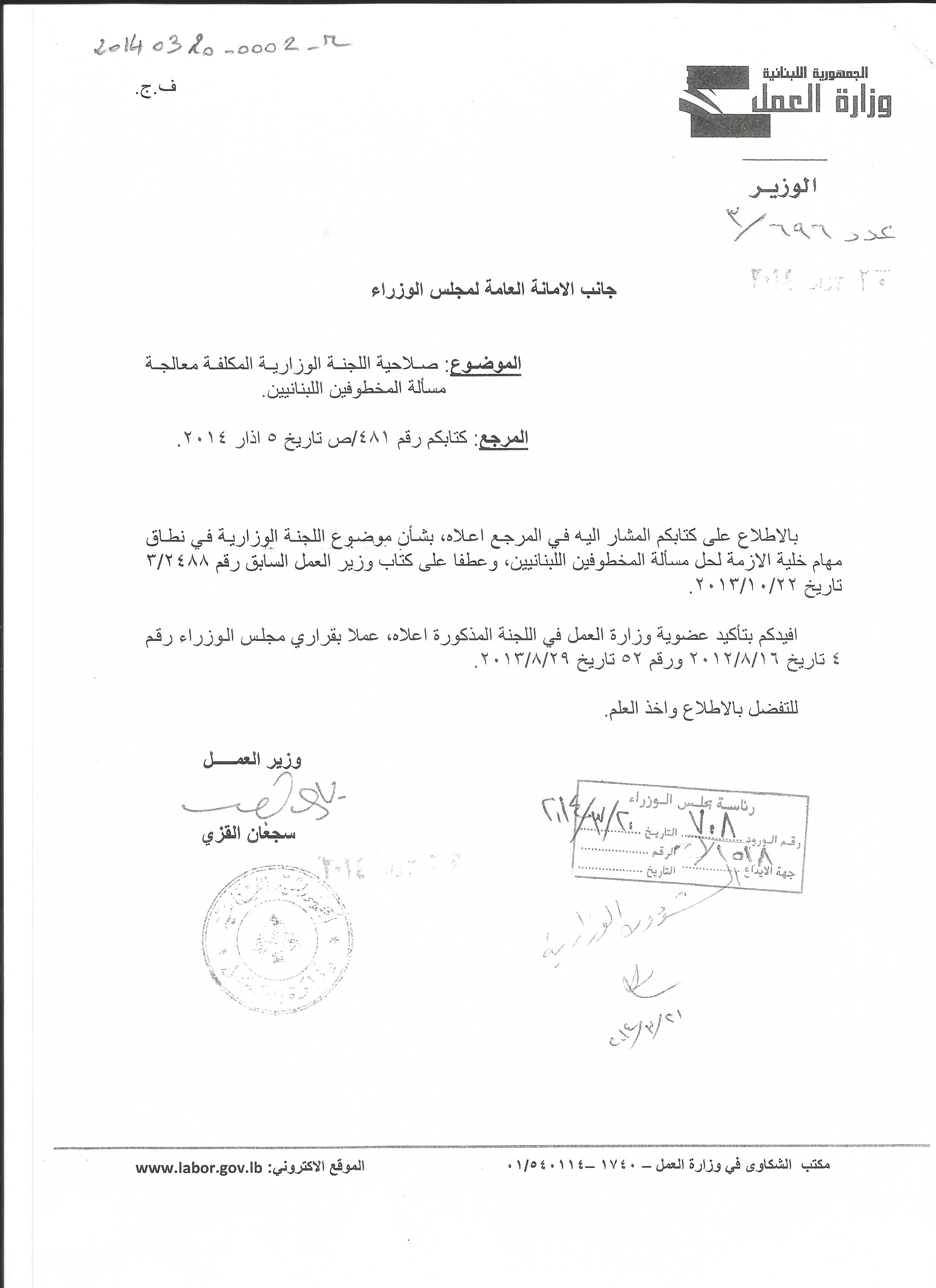 كتاب وزير العمل الى الامانة العامة لمجلس الوزراء حول صلاحية اللجنة الوزارية المكلفة معالجة مسألة المخطوفين اللبنانيين
