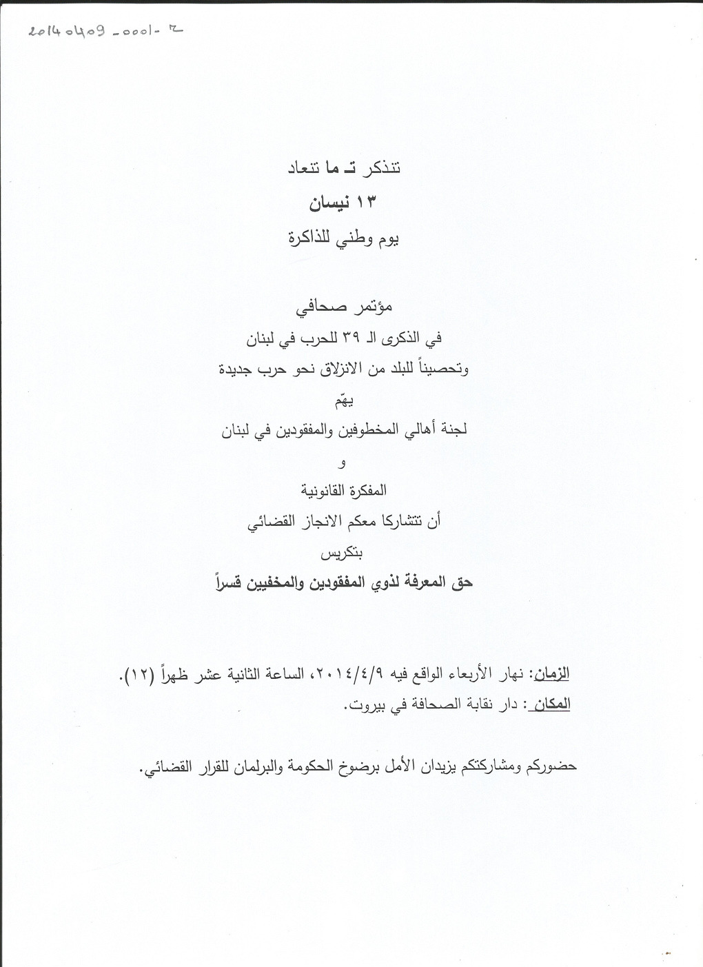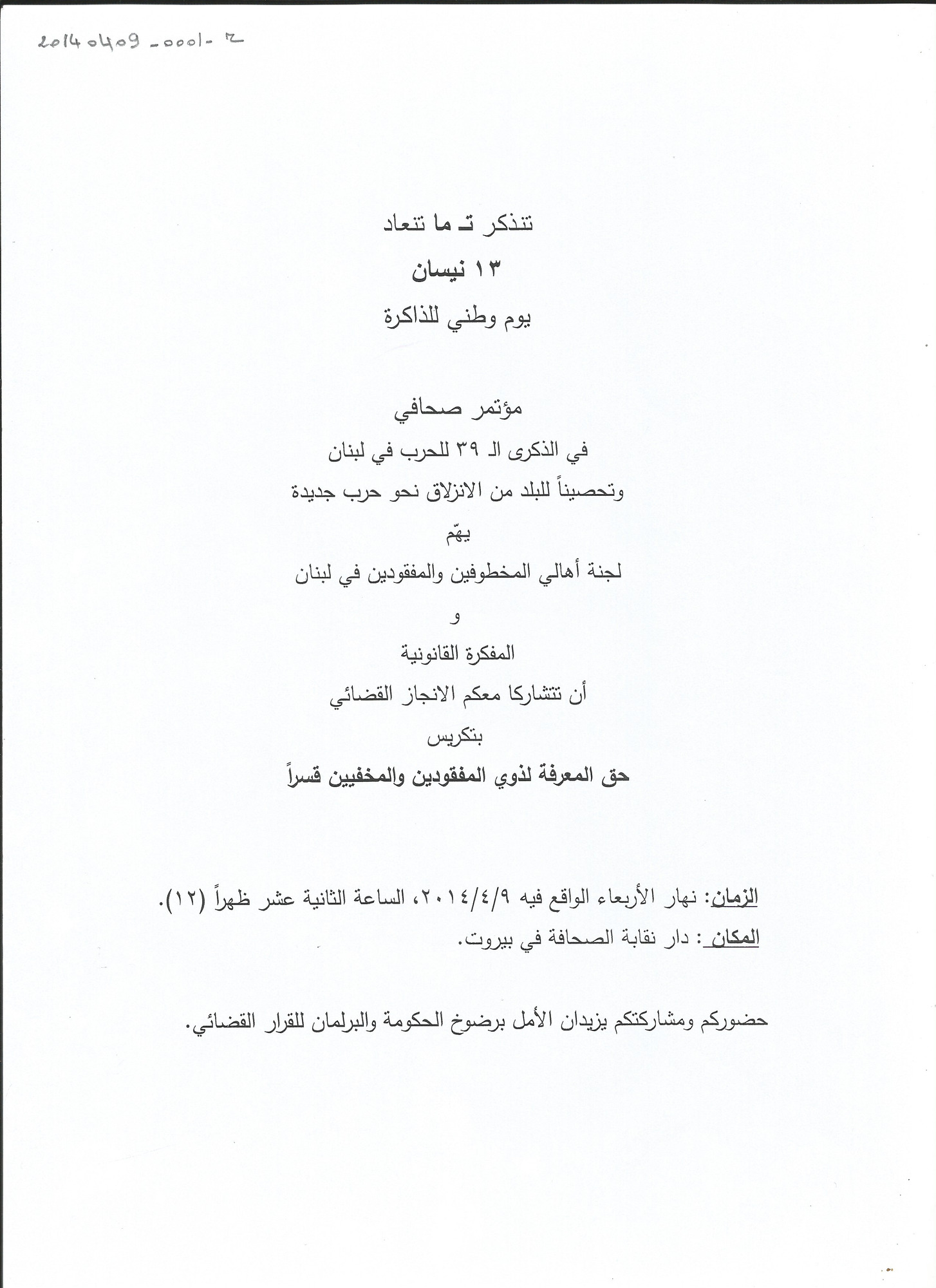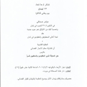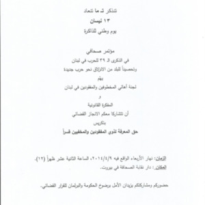 - ar دعوة لجنة الاهالي الى مؤتمر صحافي في الذكرى 39 للحرب