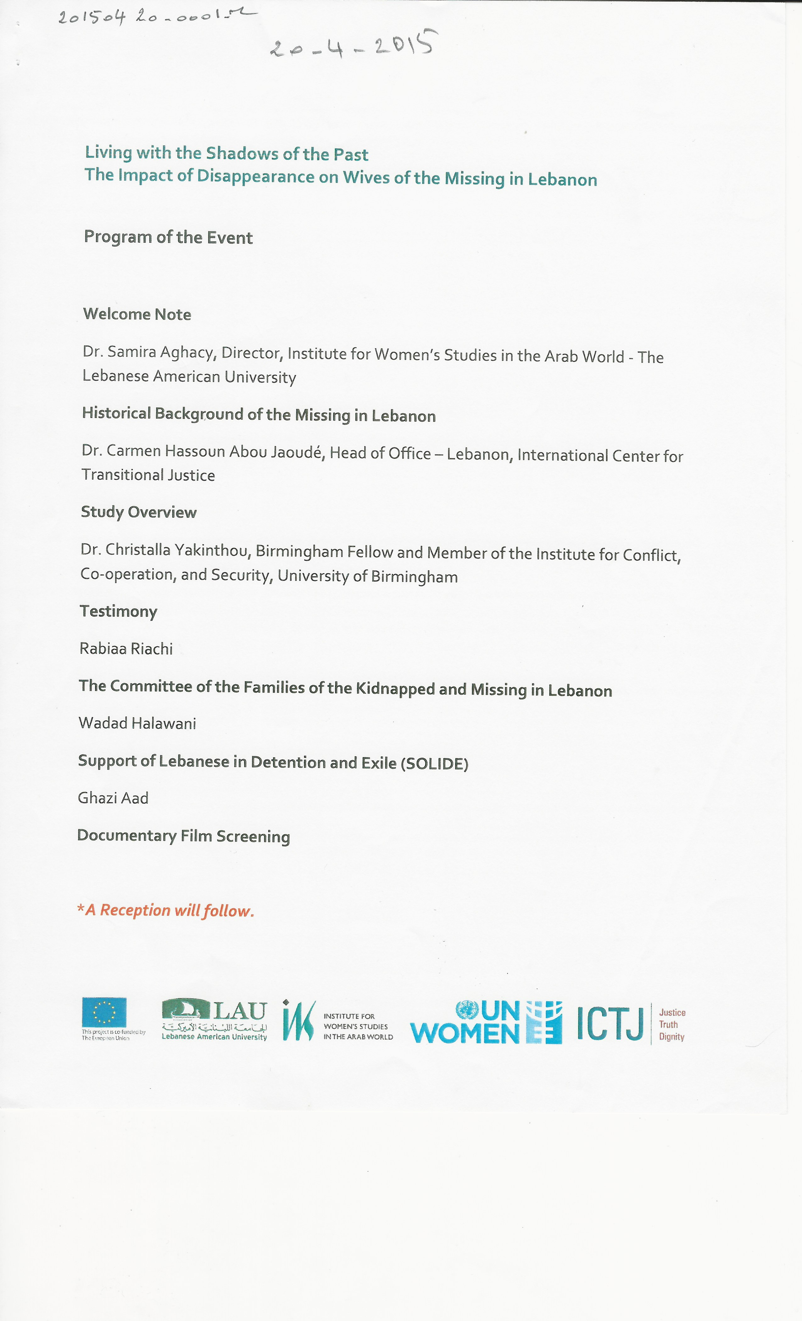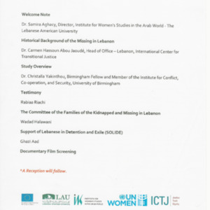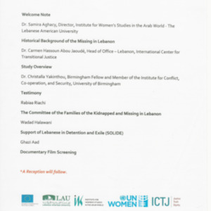 Program of the event: Living with the shadows of the past, The impact of disappearance on wives of the missing in Lebanon