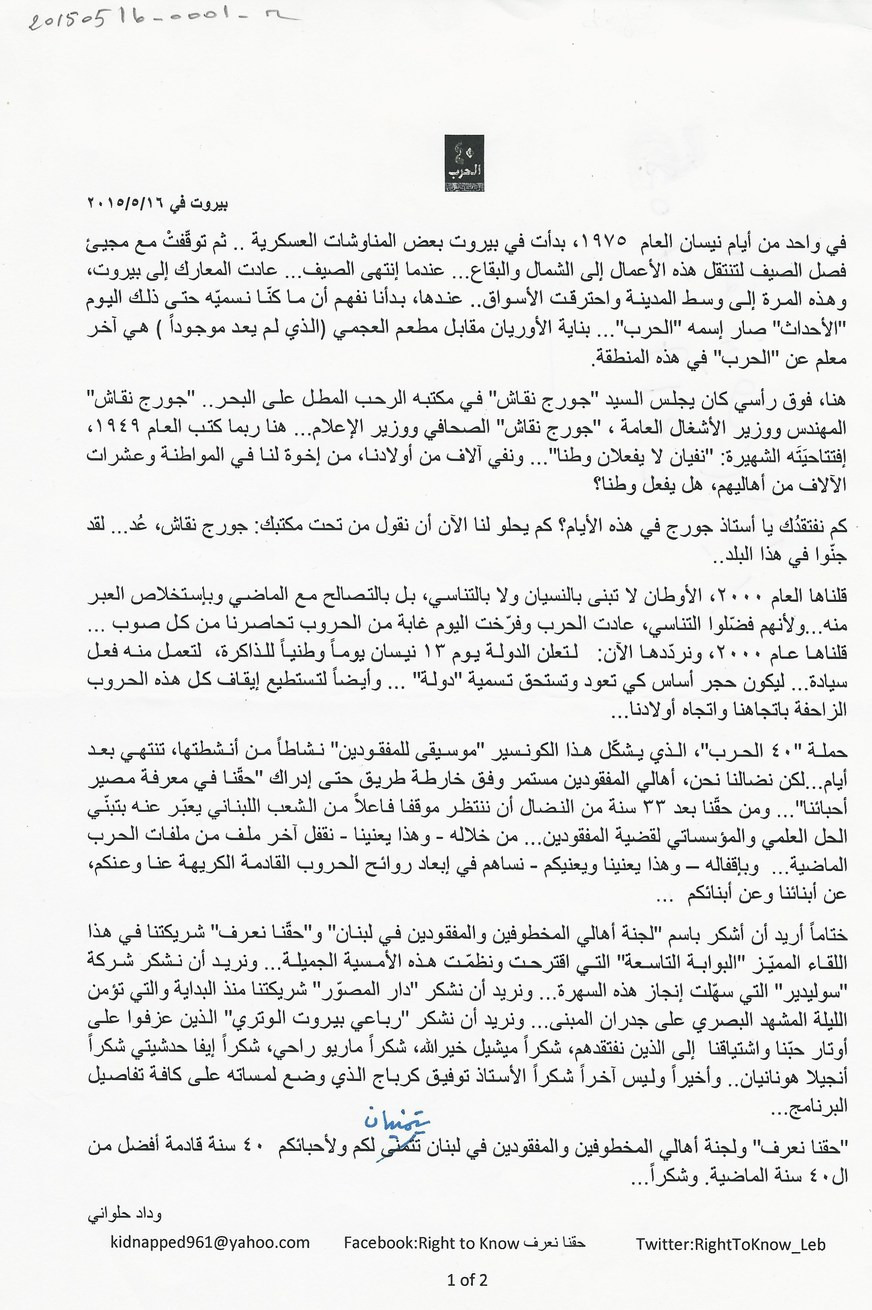 كلمة وداد حلواني في كونسير موسيقى للمفقودين في اطار انشطة حملة 40 الحرب