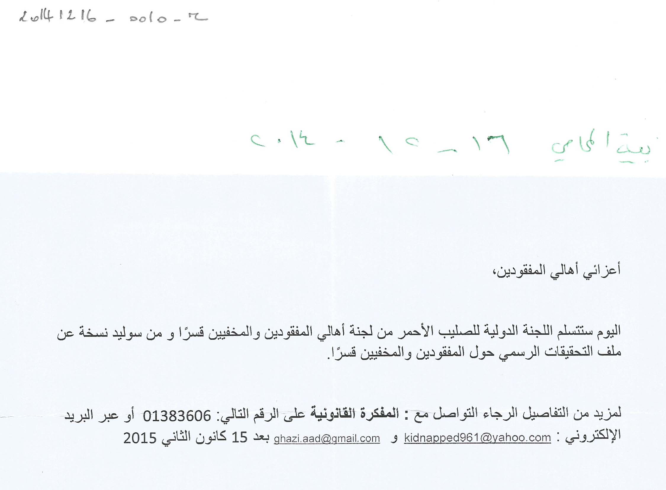 لجنة اهالي المخطوفين والمفقودين وسوليد تسلم الصليب الاحمر الدولي نسخة عن ملف التحقيقات الرسمية