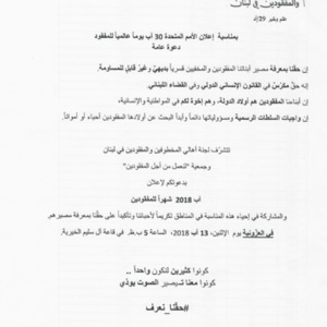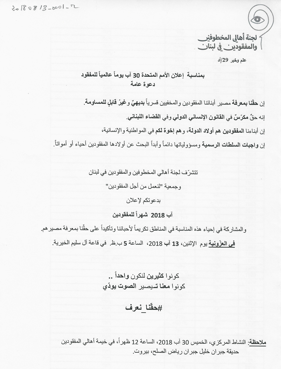 دعوة عامة لاعلان آب 2018 شهرا للمفقودين في العزونية