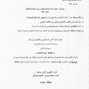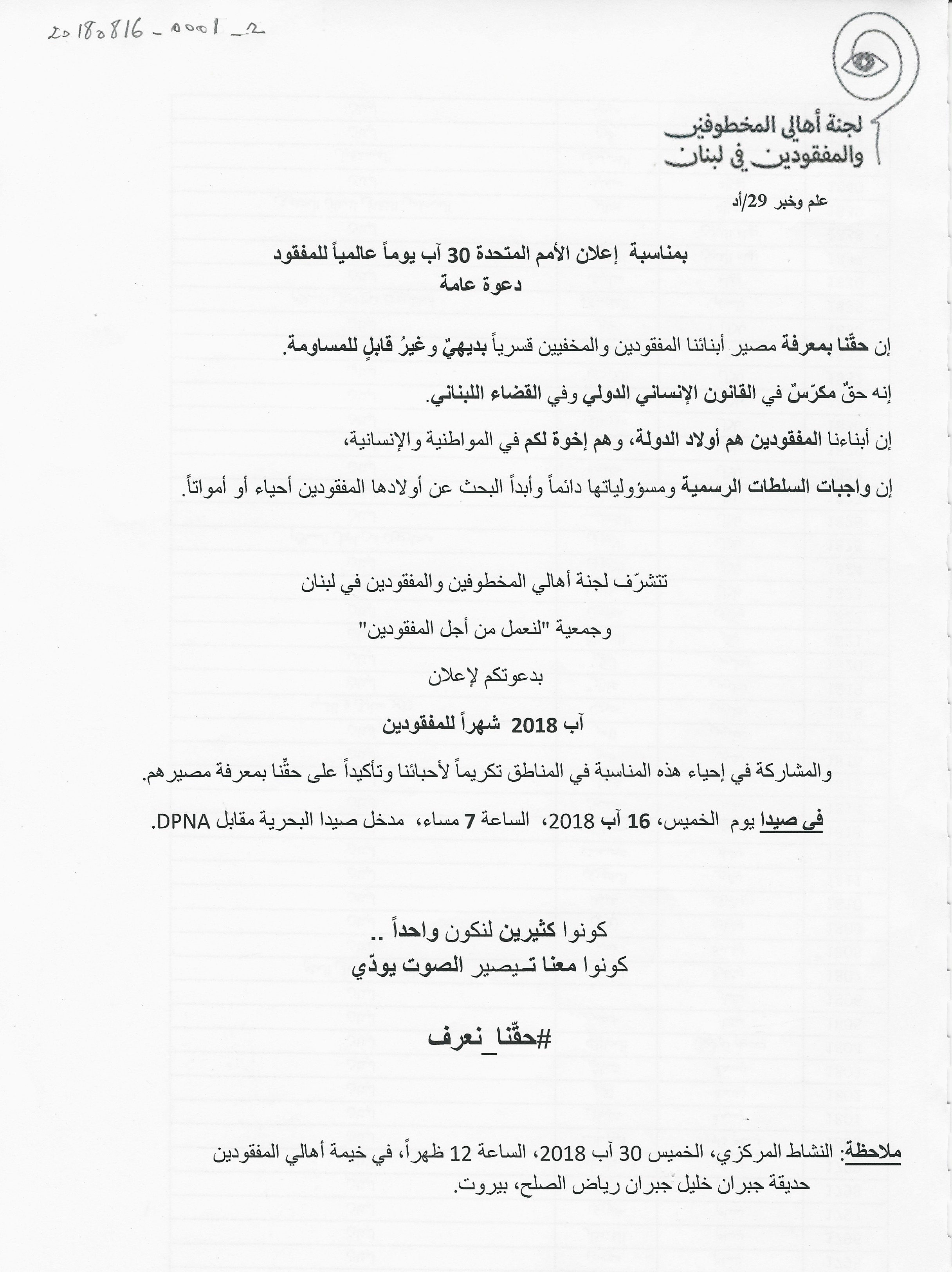 دعوة عامة لاعلان آب 2018 شهرا للمفقودين في صيدا