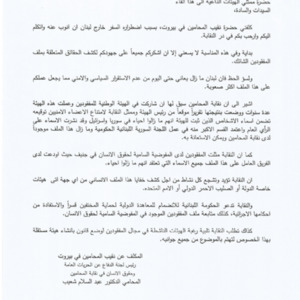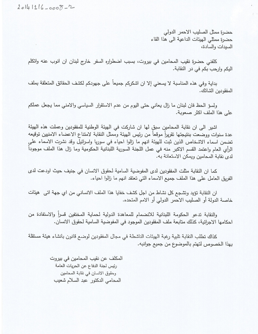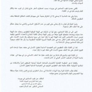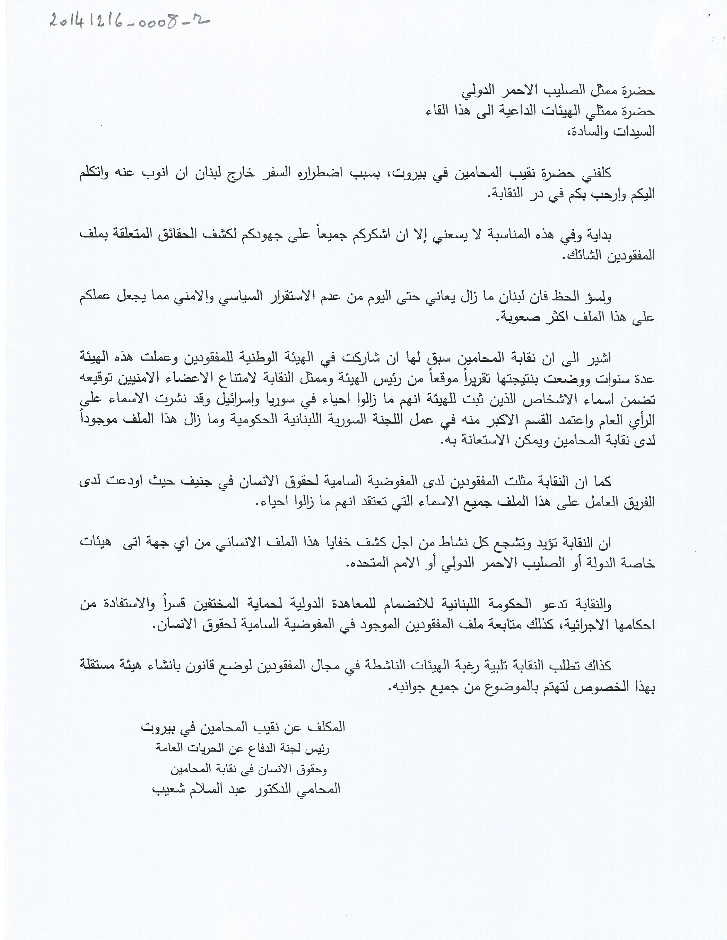 - ar كلمة نقابة المحامين في بيروت في حفل تسليم أهالي المفقودين والمخفيين قسرا ملف التحقيق الرسمي