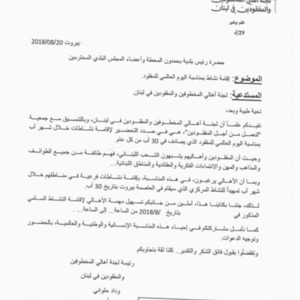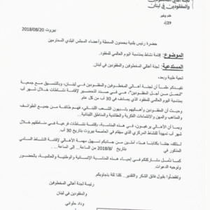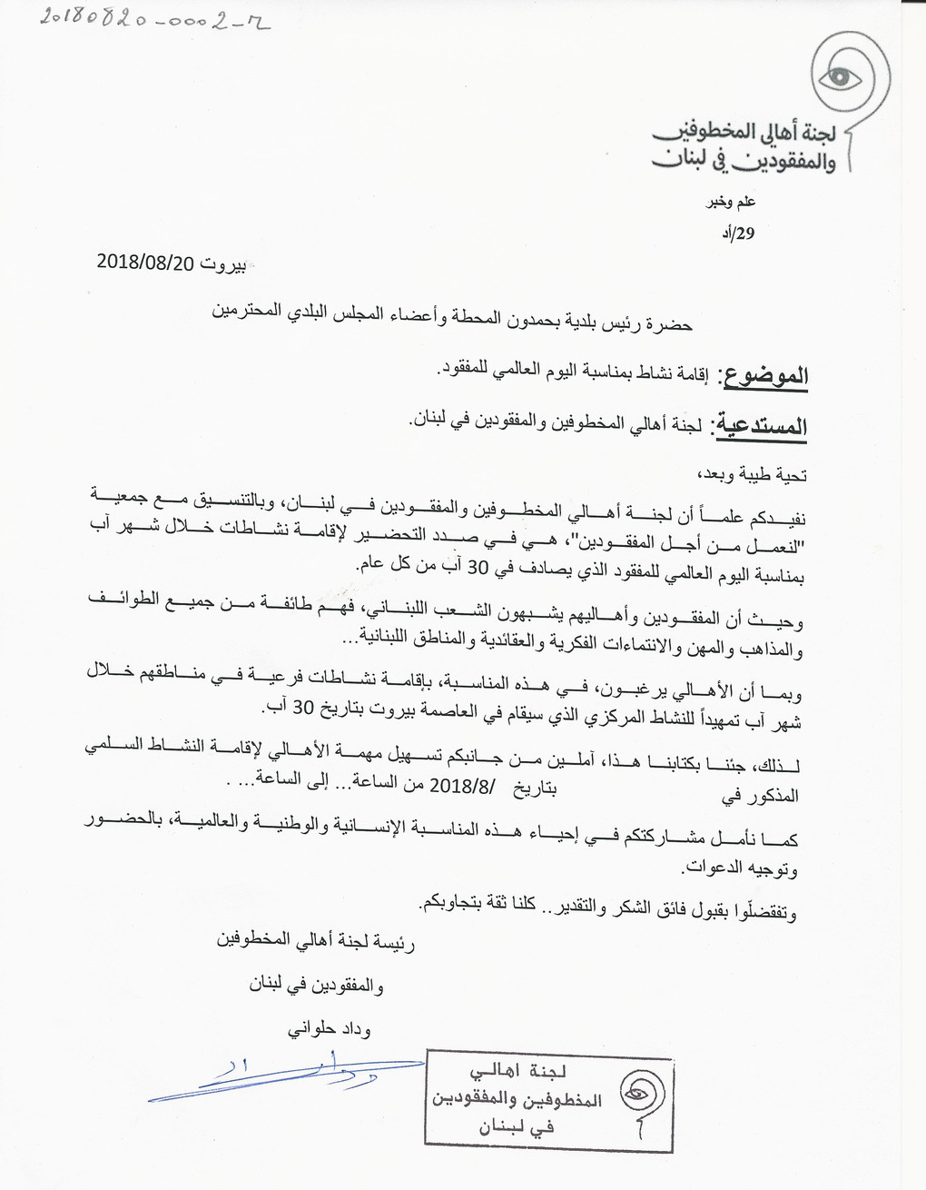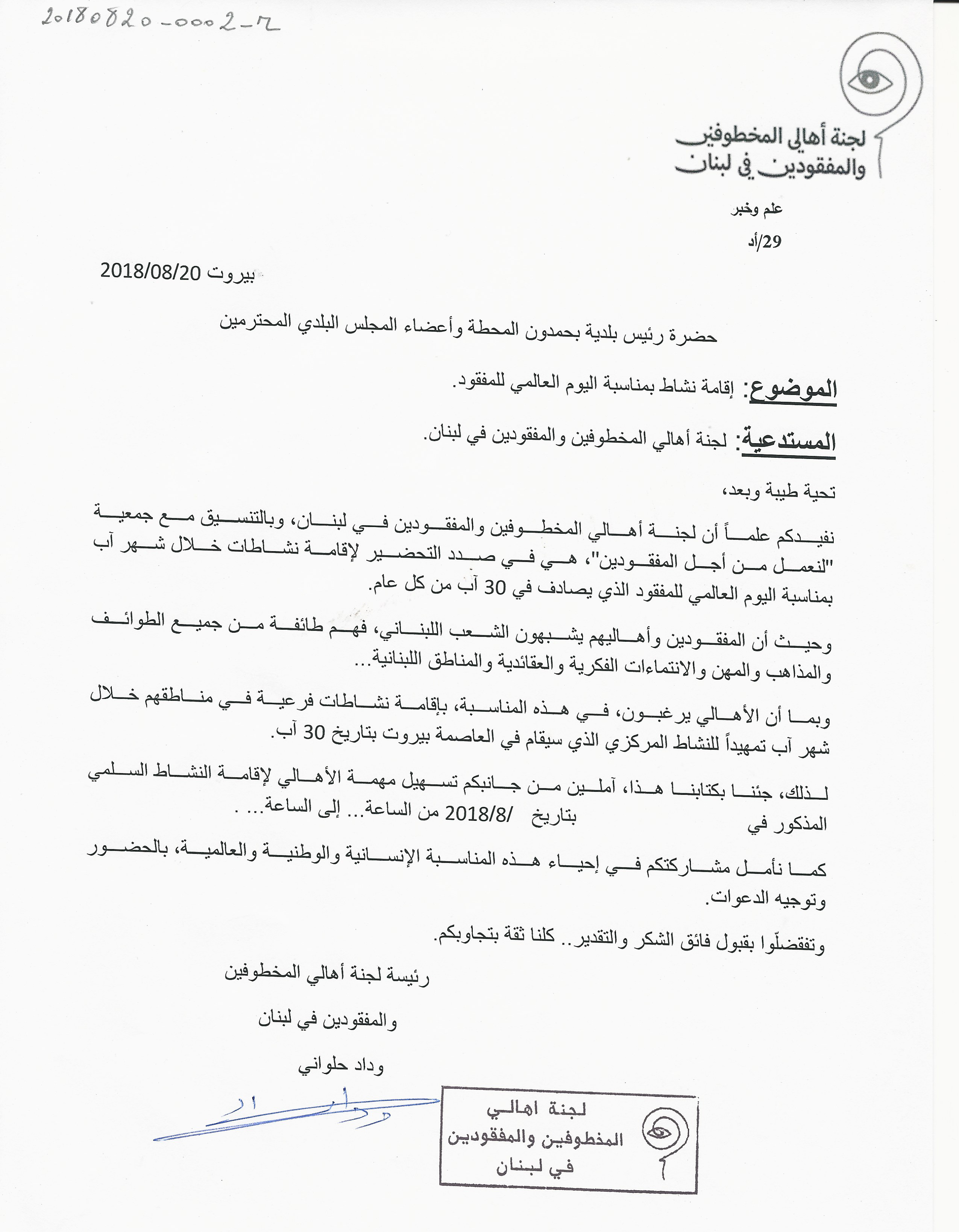 كتاب من لجنة اهالي المخطوفين والمفقودين الى رئيس بلدية بحمدون المحطة واعضاء المجلس البلدي، لاقامة نشاط بمناسبة اليوم العالمي للمفقود