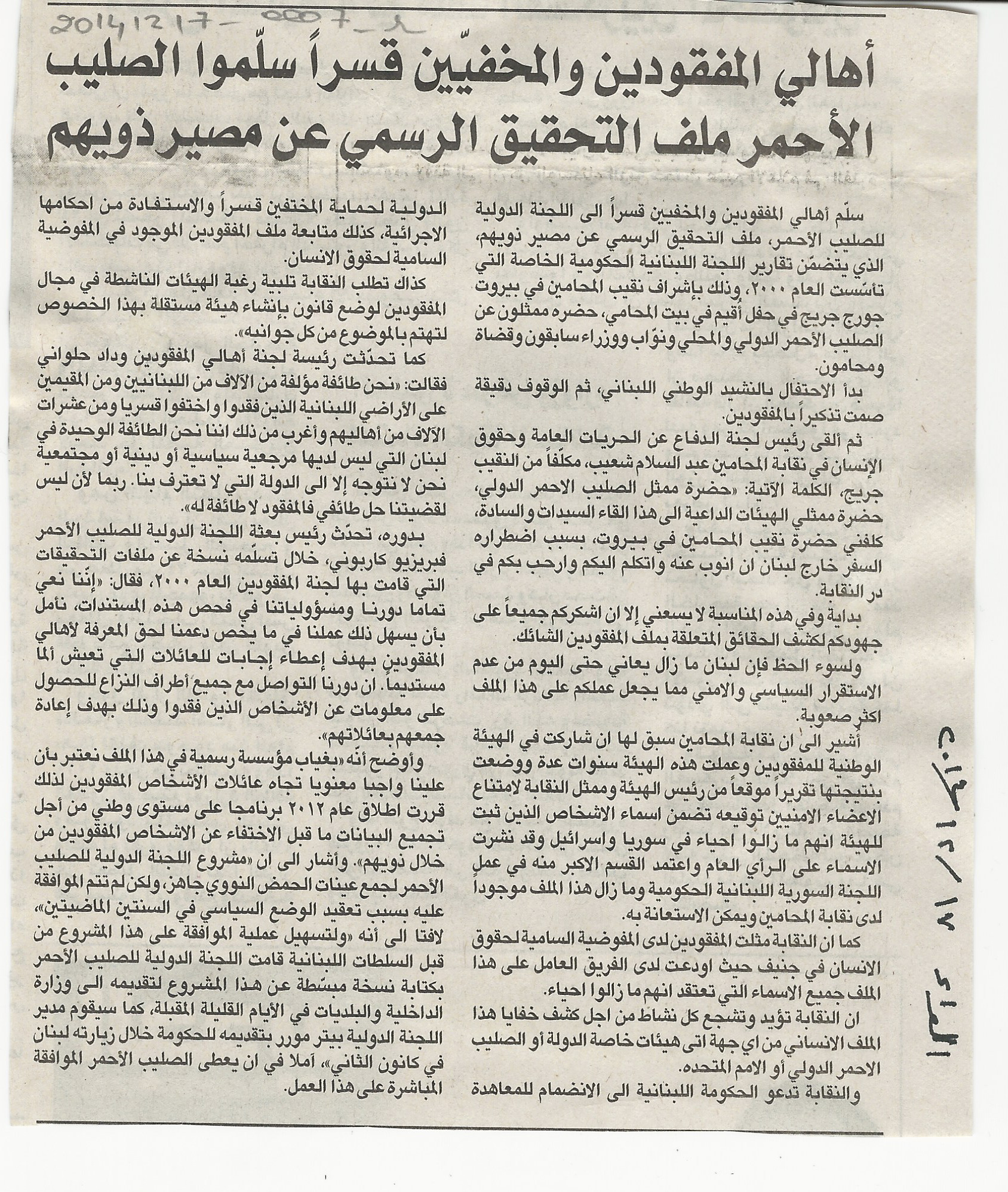 - ar اهالي المفقودين والمخفيين قسرا سلموا الصليب الاحمر ملف التحقيق الرسمي عن مصير ذويهم