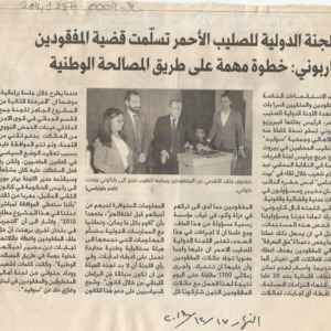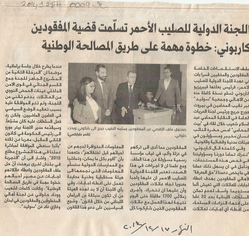 اللجنة الدولية للصليب الاحمر تسلمت قضية المفقودين، كاربوني: خطوة مهمة على طريق المصالحة الوطنية
