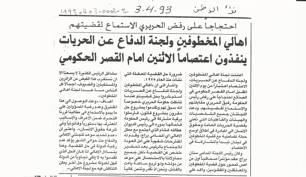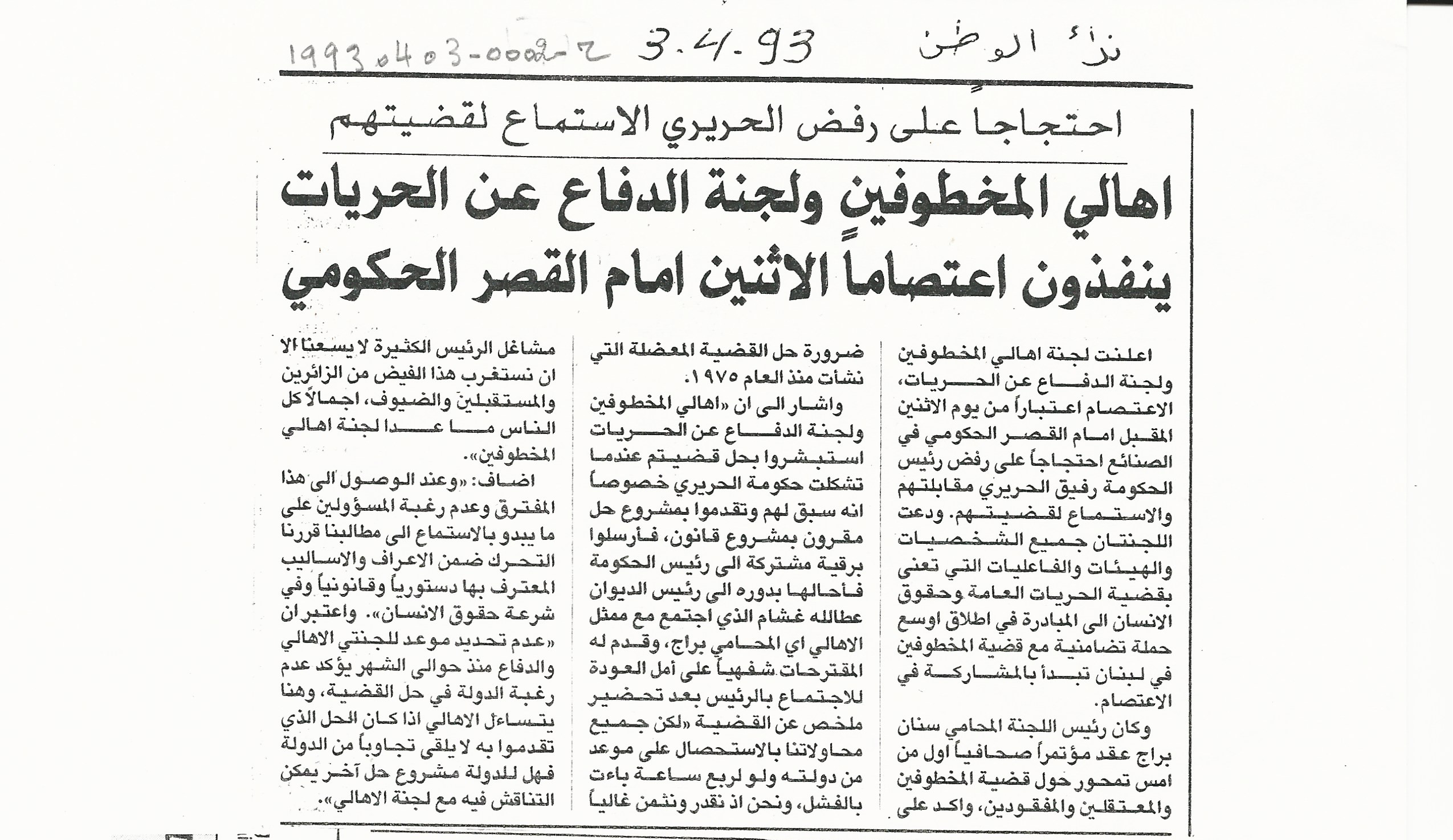The Committee of the Families of the Kidnapped and the Committee for Defending freedoms hold a joint sit-in Monday in front of the Serail, in protest to al-Hariri's refusal to listen to their issue.