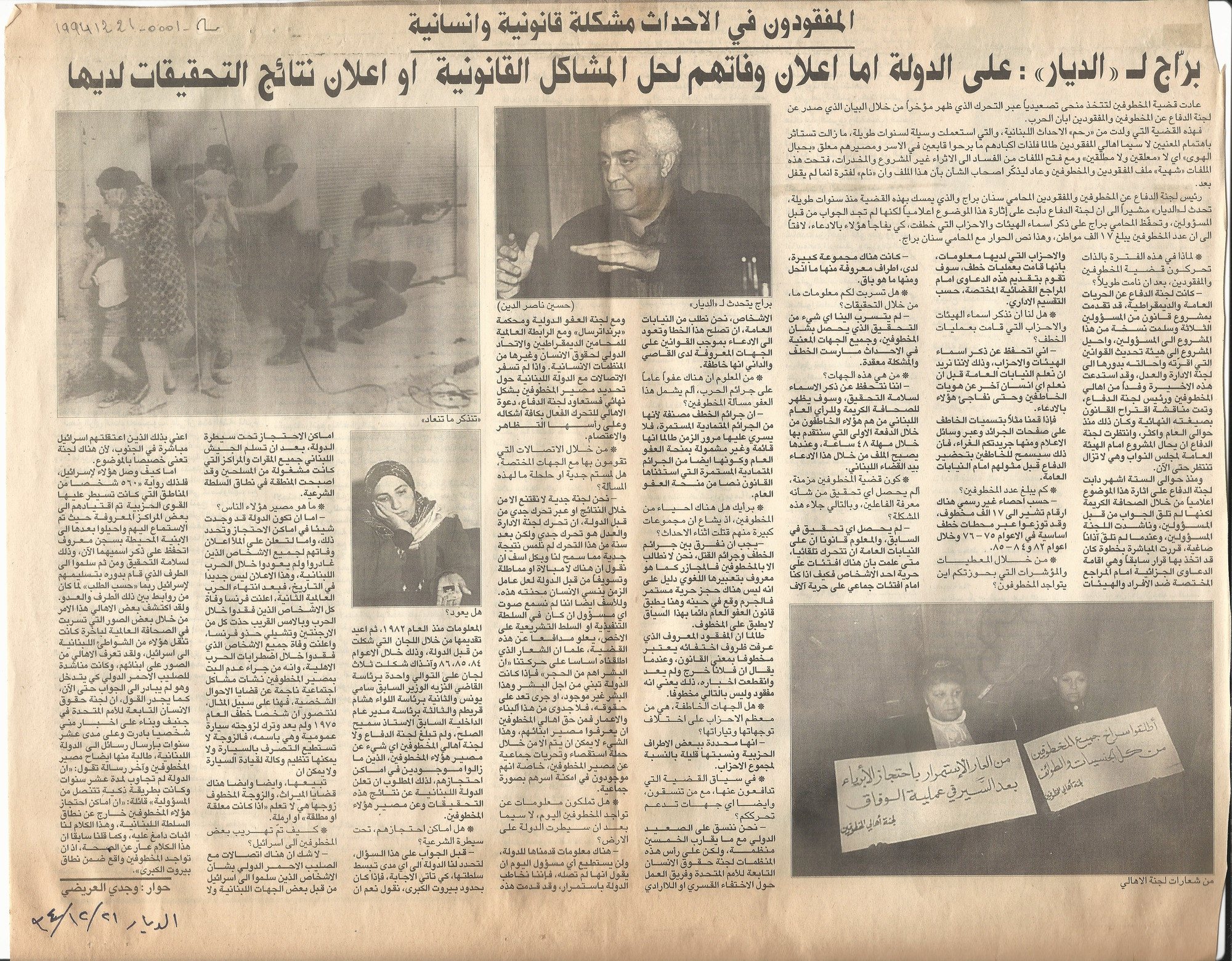 In an interview with al-Diyar Daily, Barraj: The issue of the wartime missing is legal and humanitarian. The State shall either declare their presumed death in an attempt to solve the legal problems or disclose the findings of investigations