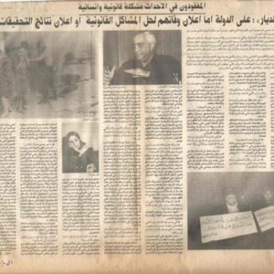 المفقودون في الاحداث مشكلة قانونية وانسانية، براج للديار: على الدولة اما اعلان وفاتهم لحل المشاكل القانونية او اعلان نتائج التحقيقات لديها