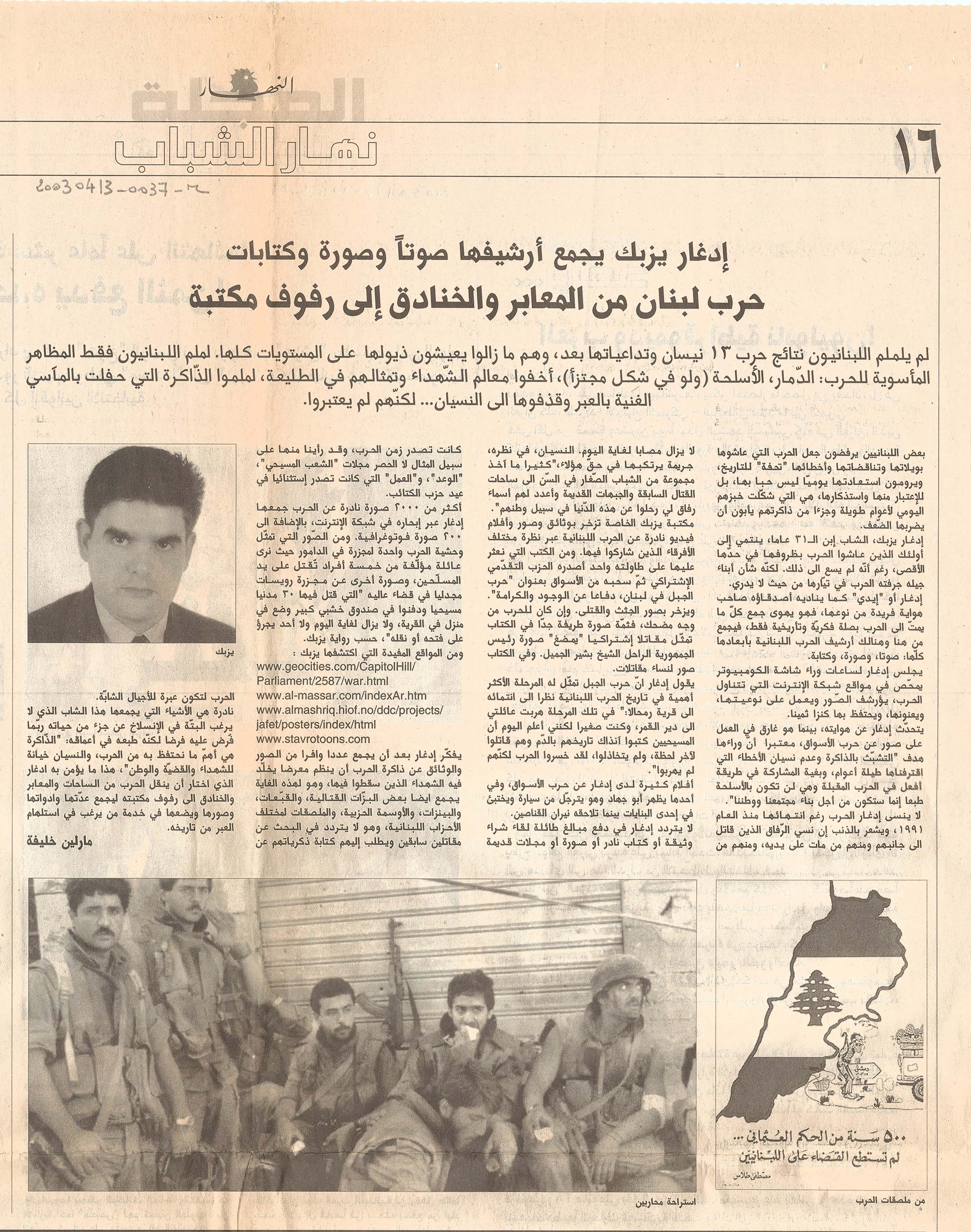 Edgar Yazbek gathers audio-visual, and written archival materials: The war of Lebanon is transferred from the crossing points and trenches to the shelves of a library.