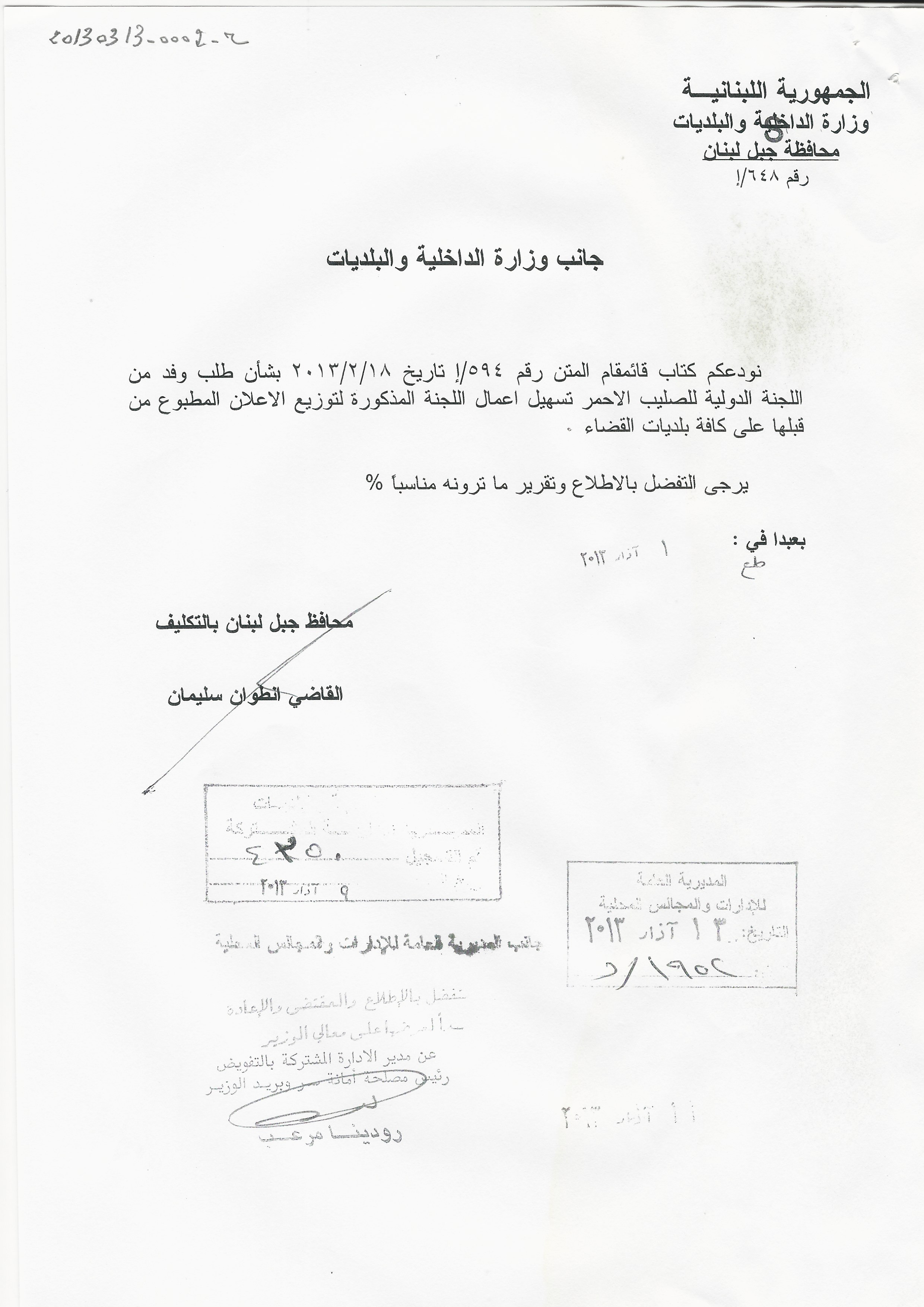 كتاب محافظ جبل لبنان الى وزارة الداخلية والبلديات حول اتفاق مع اللجنة الدولية للصليب الاحمر بشأن جمع وحفظ العينات البيولوجية من افراد اسر المفقودين