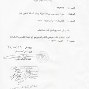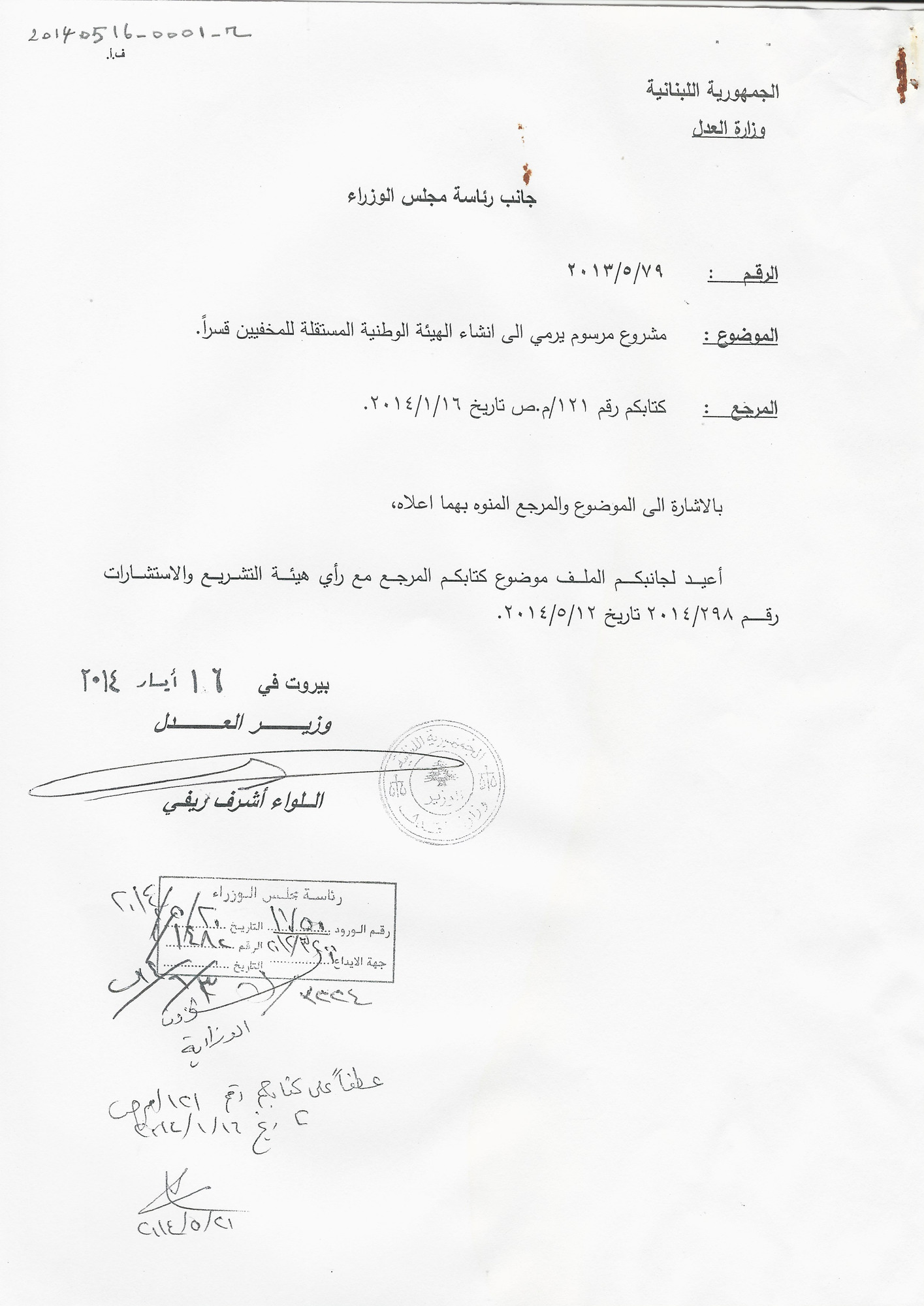 كتاب وزير العدل الى رئاسة مجلس الوزراء بشأن مشروع مرسوم يرمي الى انشاء الهيئة الوطنية المستقلة للمخفيين قسرا