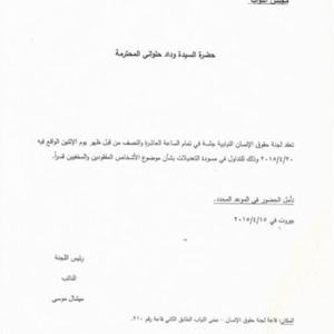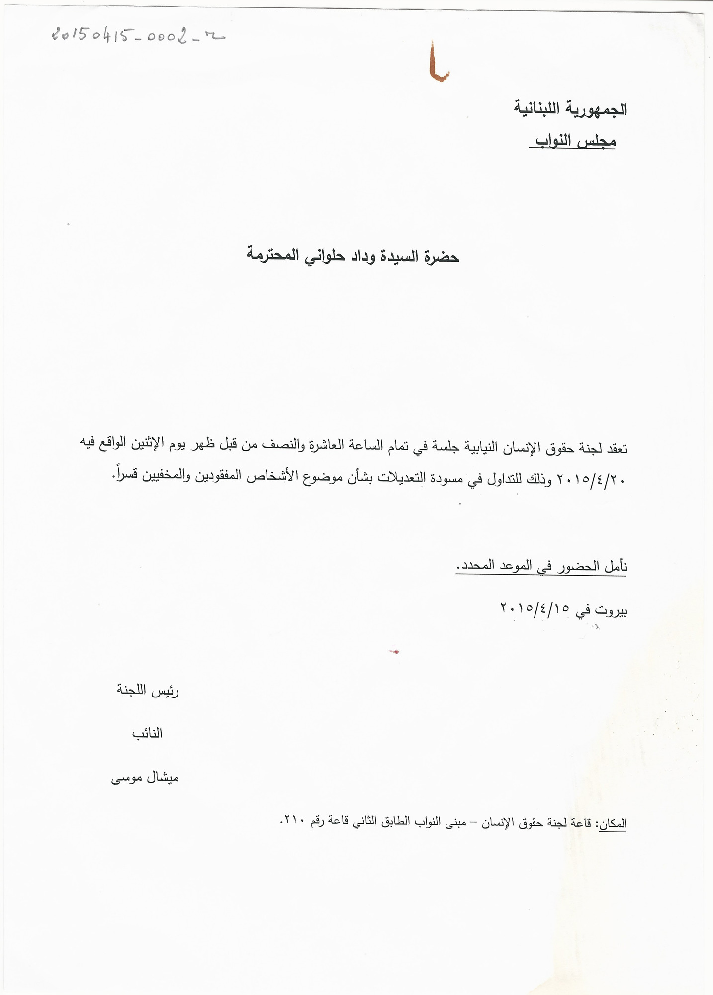 - ar دعوة للسيدة وداد حلواني لحضور اجتماع مع لجنة حقوق الانسان النيابية