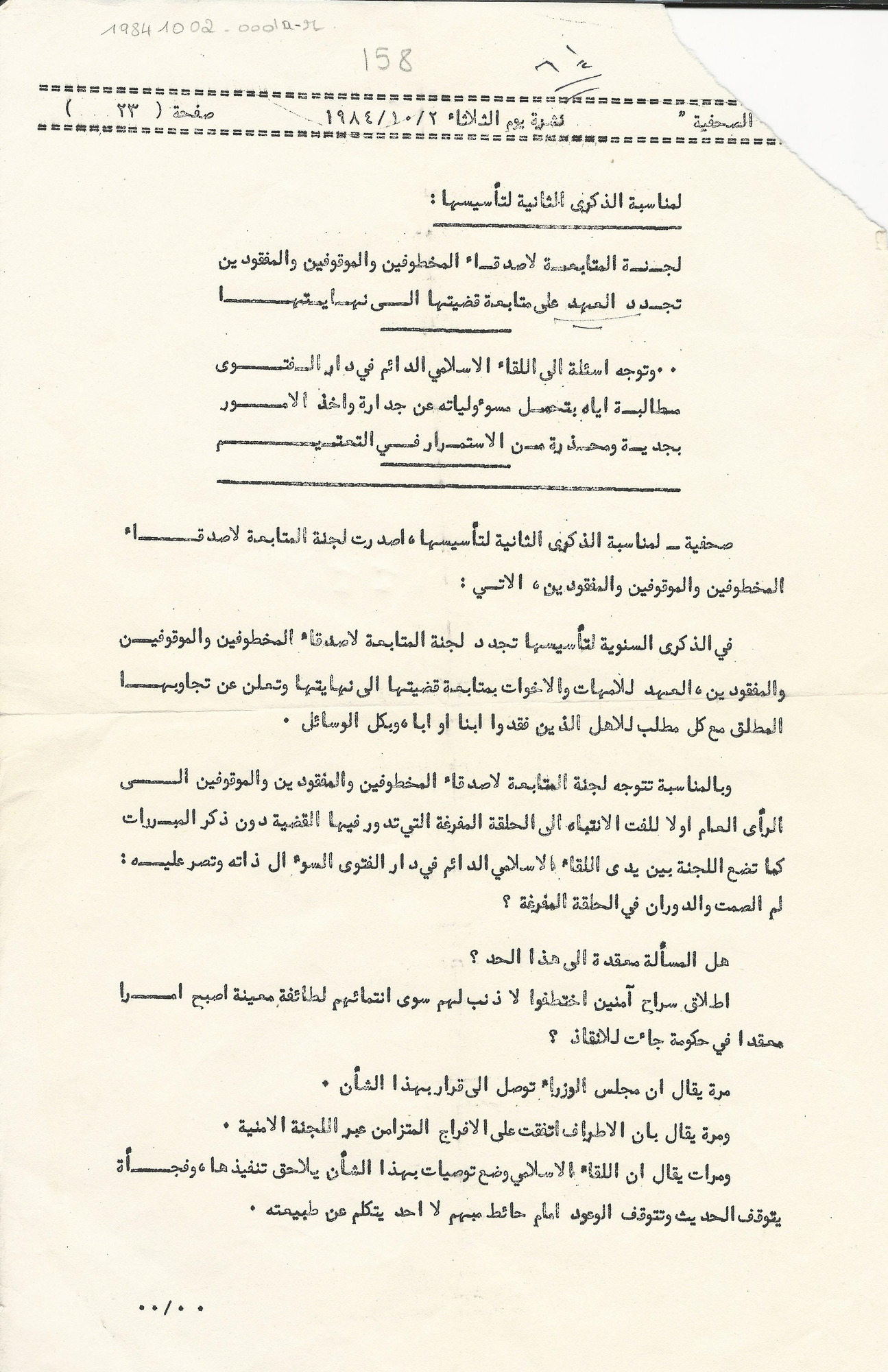 On the second anniversary that marks its establishment: The Follow-up Committee of the Friends of the Kidnapped, Arrested and Missing pledges anew its commitment to follow up the issue until the end.