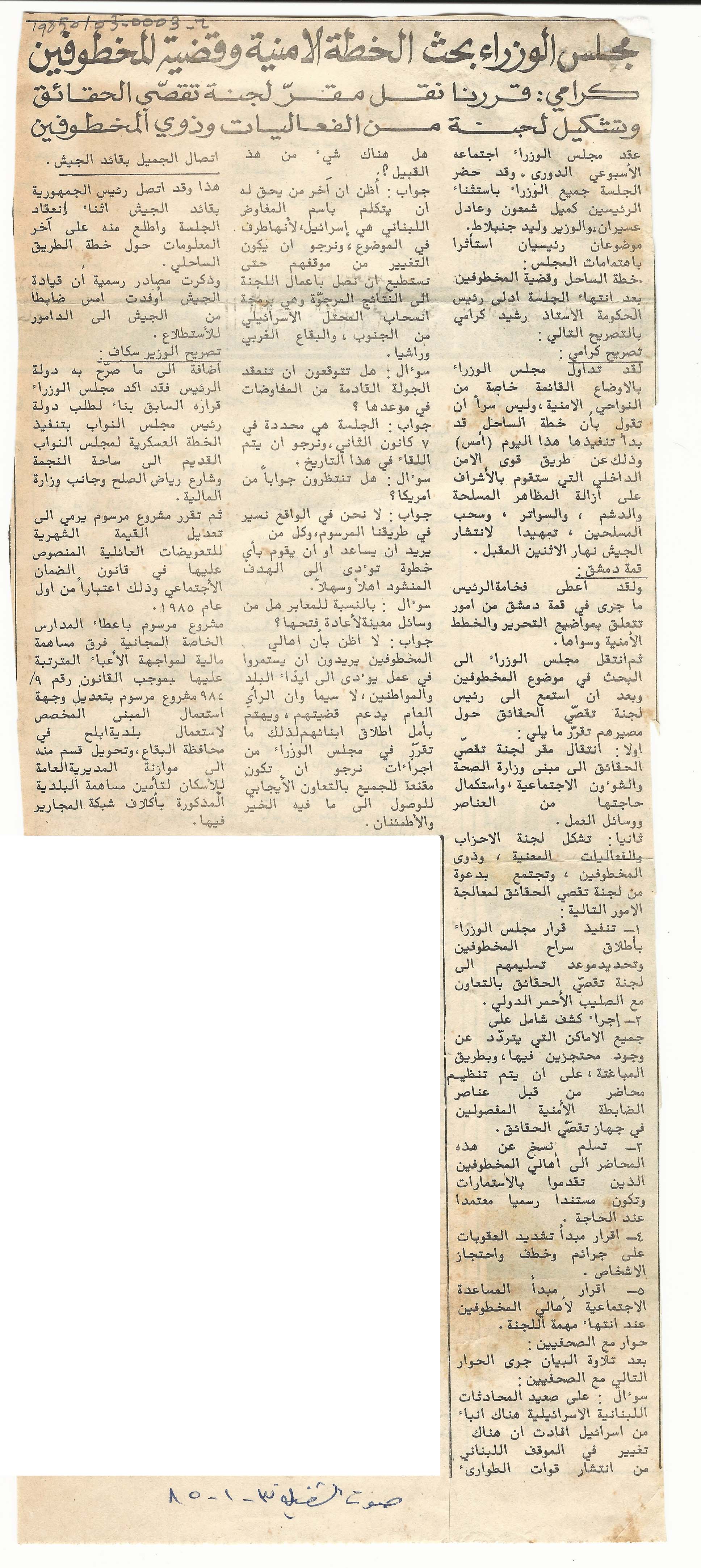 The cabinet of ministers discussed the security plan and the issue of the kidnapped. Karami: We decided to move the office of the fact-finding committee and to form a committee of actors and of families of the kidnapped.