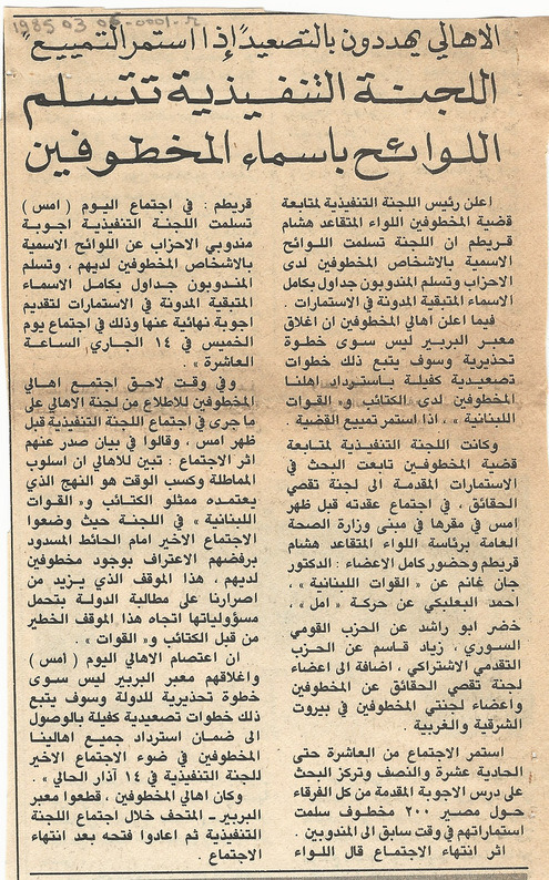 الاهالي يهددون بالتصعيد اذا استمر التمييع، اللجنة التنفيذية تتسلم اللوائح باسماء المخطوفين
