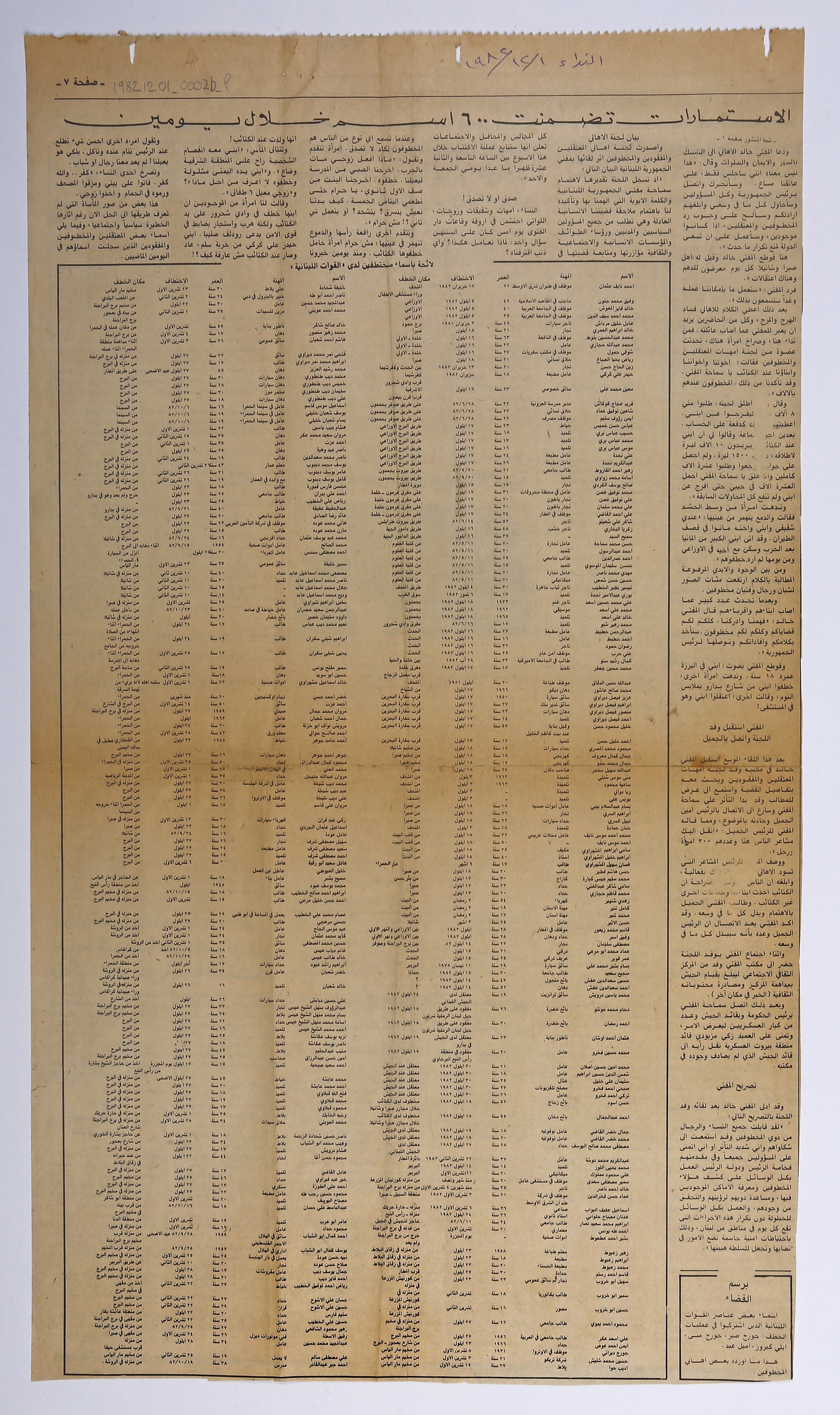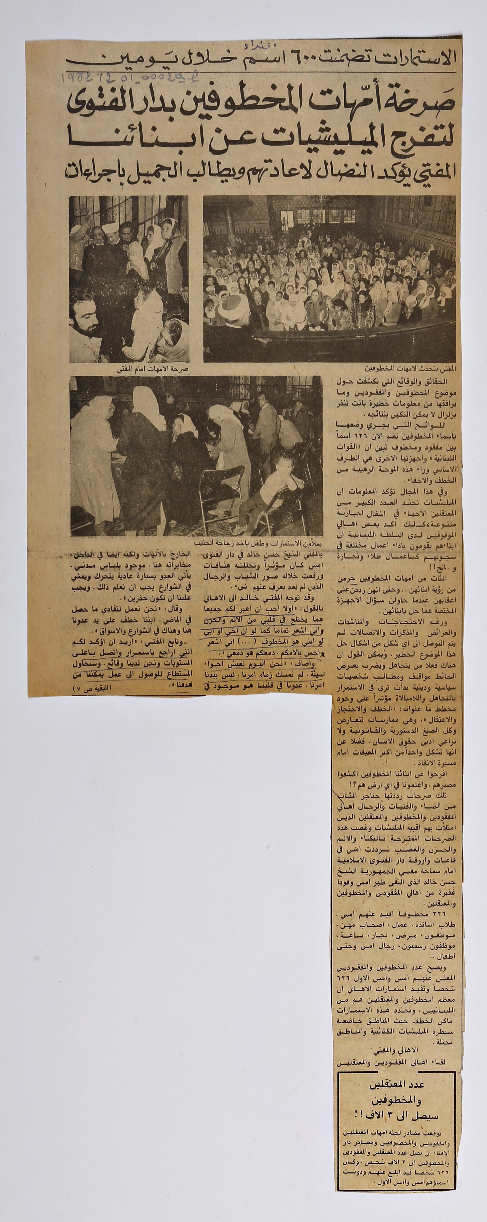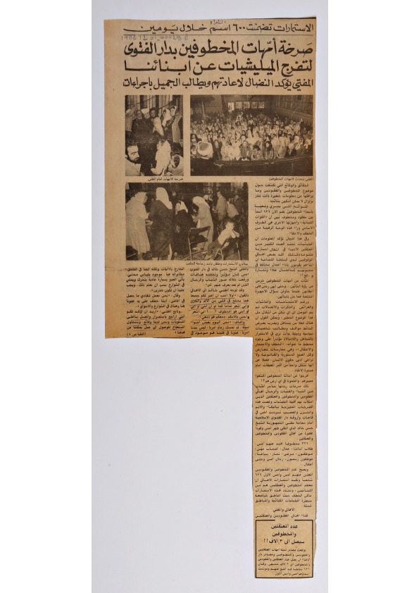 The mothers of the kidnapped gather at Dar al- Fatwa, crying ‘Militias, release our children’, the Mufti insists on the struggle to have them back and asks Gemayel to take action. Forms have already included 600 names within two days.