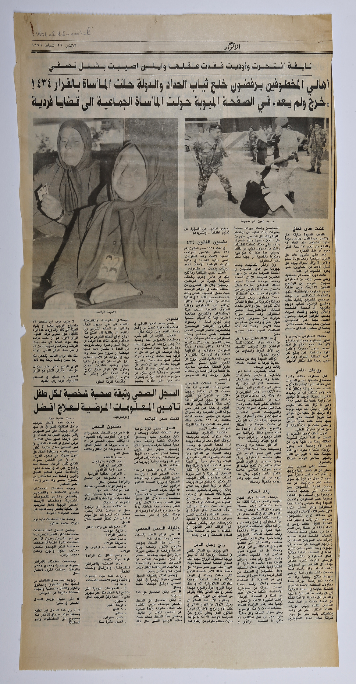 اهالي المخطوفين يرفضون خلع ثياب الحداد والدولة حلت المأساة بالقرار 434، خرج ولم يعد في الصفحة المبوبة حولت المأساة الجماعية الى قضايا فردية، نايفة انتحرت واوديت فقدت عقلها وايلين اصيبت بشلل نصفي