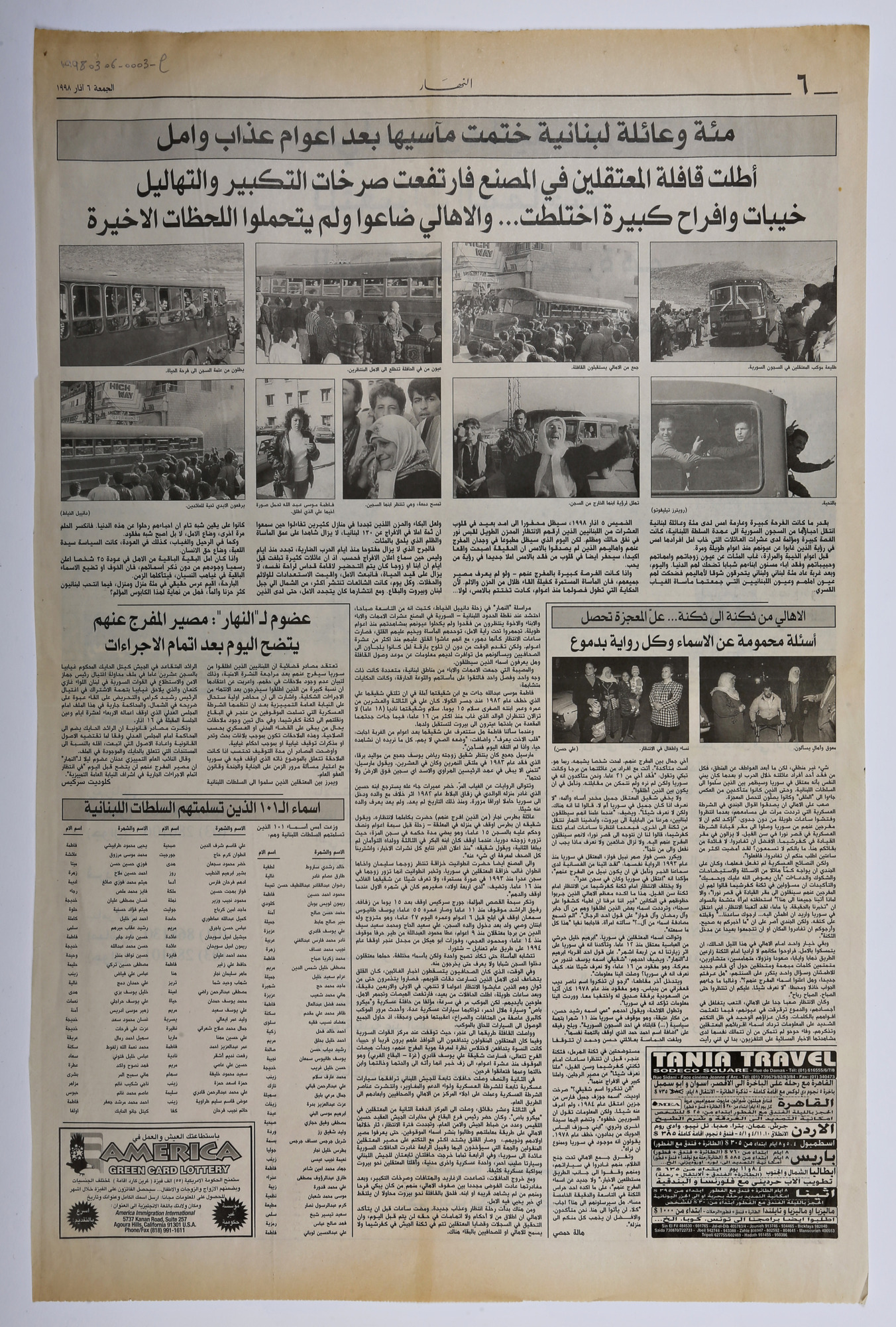 One hundred and one Lebanese families ended their tragedies following years of torture and hope. As soon as the convoy of detainees appeared at al-Masnaa checkpoint, chants of praise of God and of celebration were heard and families were overwhelmed as they couldn’t stand these last moments.