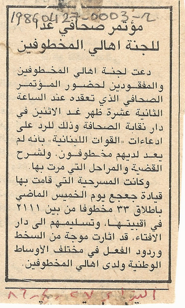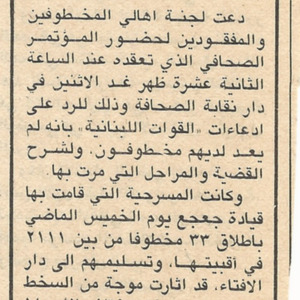 - ar مؤتمر صحافي غدا للجنة اهالي المخطوفين