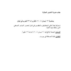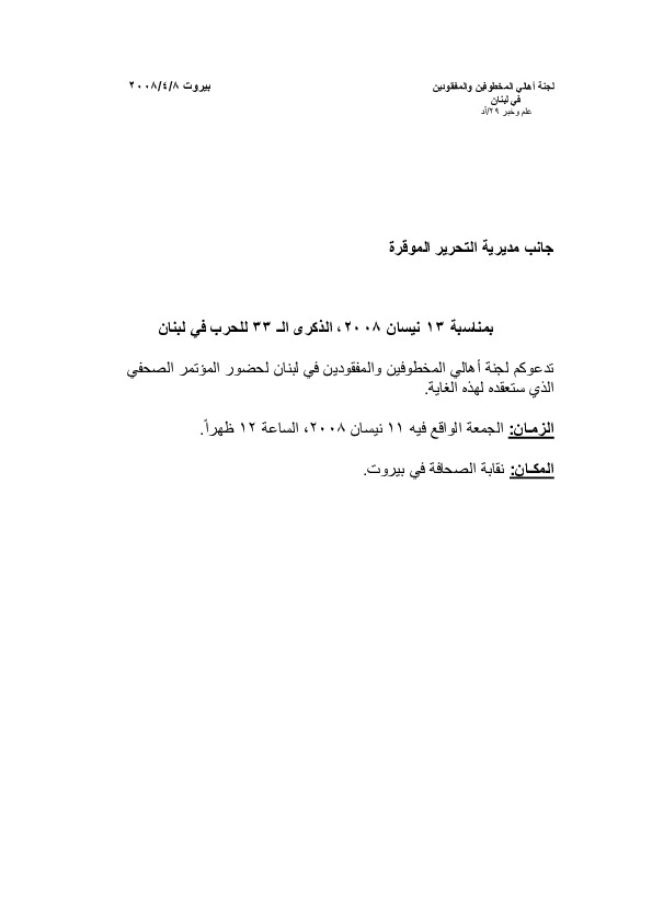 - ar دعوة لحضور مؤتمر صحافي بمناسبة 13 نيسان، 2008، الذكرى الـ 33 للحرب في لبنان