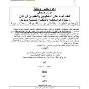 دعوة لحضور وتغطية مؤتمر صحافي تعقده لجنة أهالي المخطوفين والمفقودين في لبنان ولجنة دعم المعتقلين والمنفيين اللبنانيين سوليد، لشرح آخر التطورات والاعلان عن سلسلة تحركات وخطوات مهمة