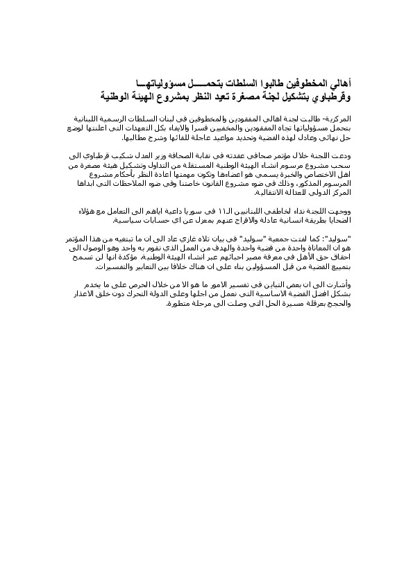 - ar أهالي المخطوفين طالبوا السلطات بتحمل مسؤولياتها وقرطباوي بتشكيل لجنة مصغرة تعيد النظر بمشروع الهيئة الوطنية