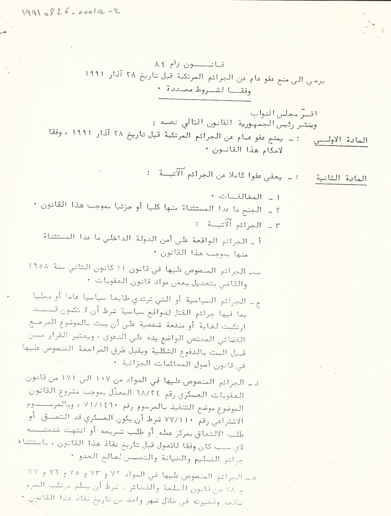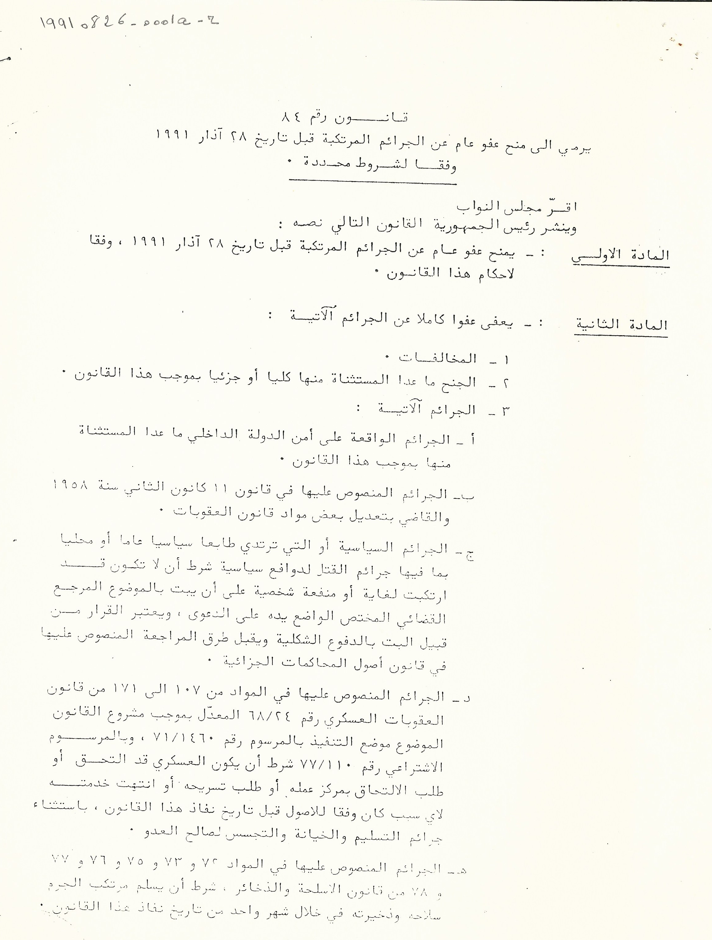 - en Law No. 84 aims at granting a general amnesty for crimes committed before March 28, 1991 under defined conditions.