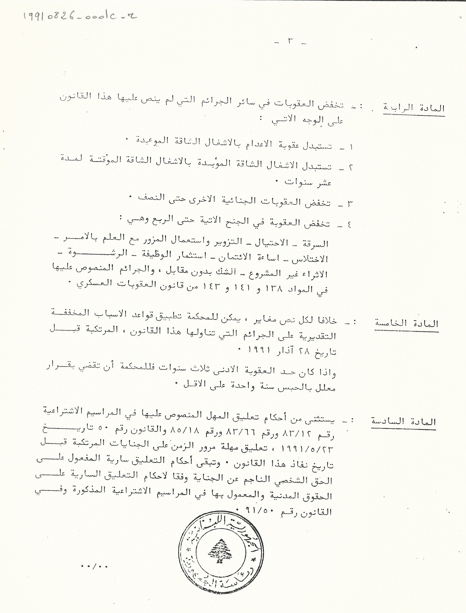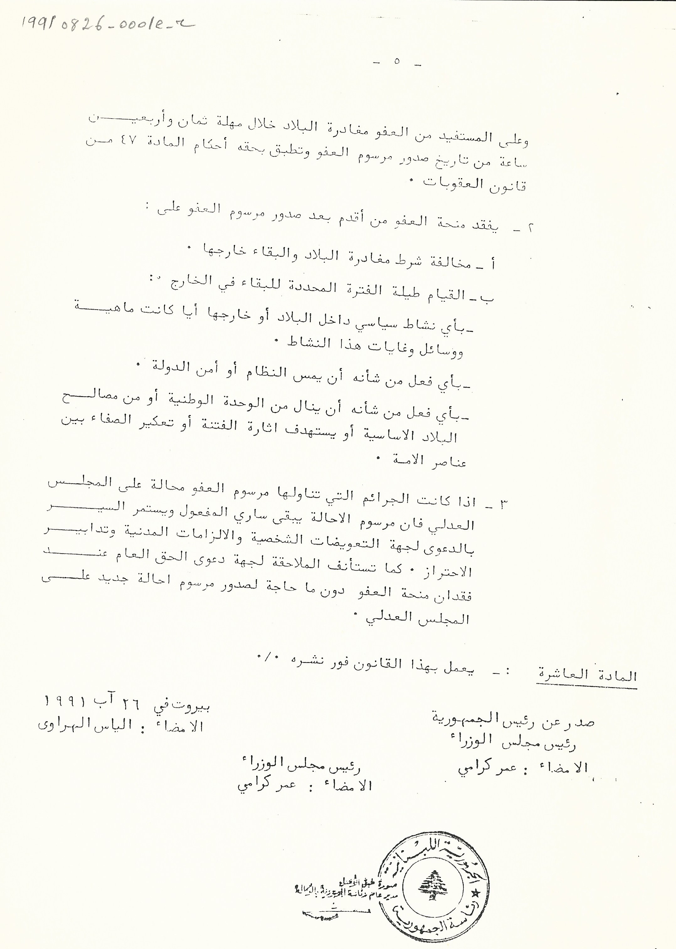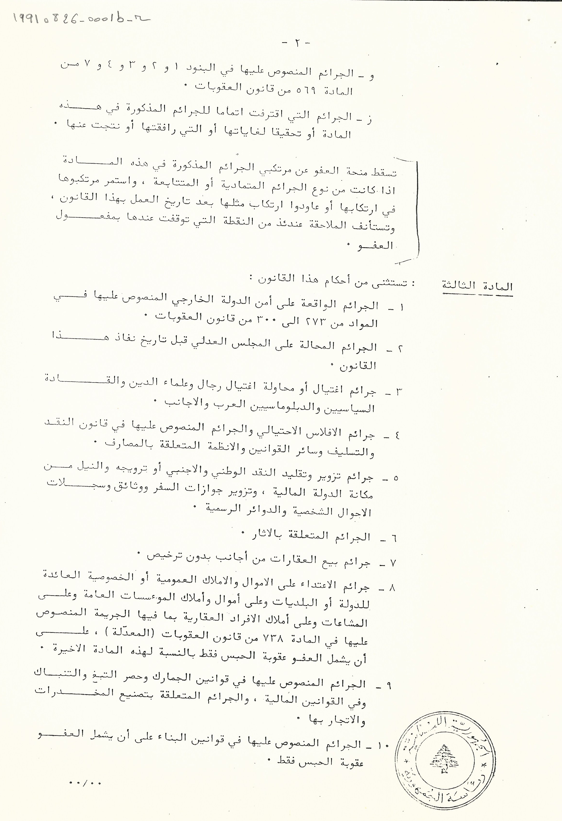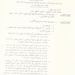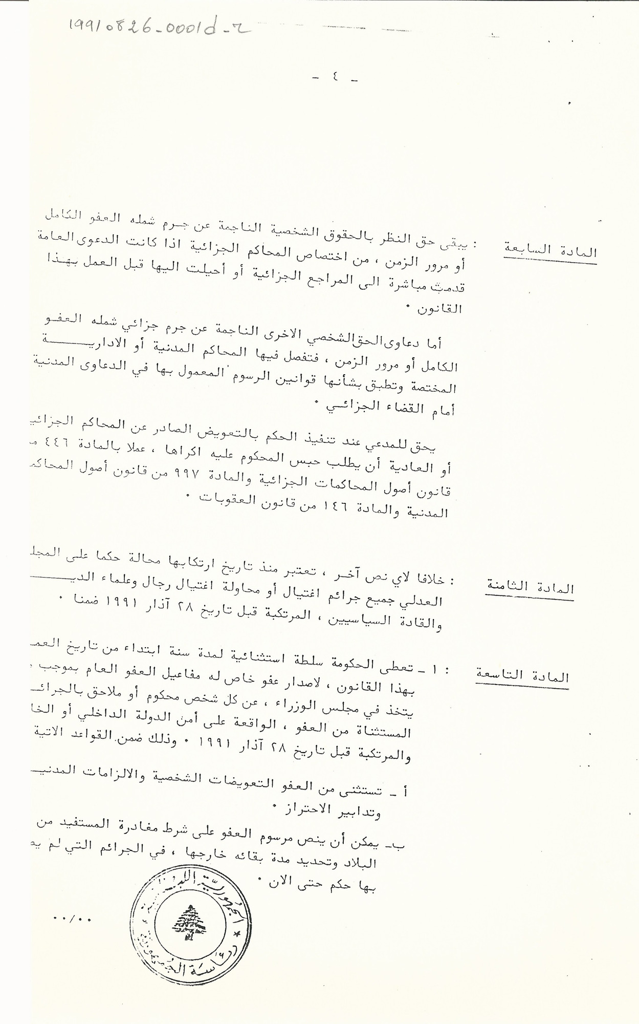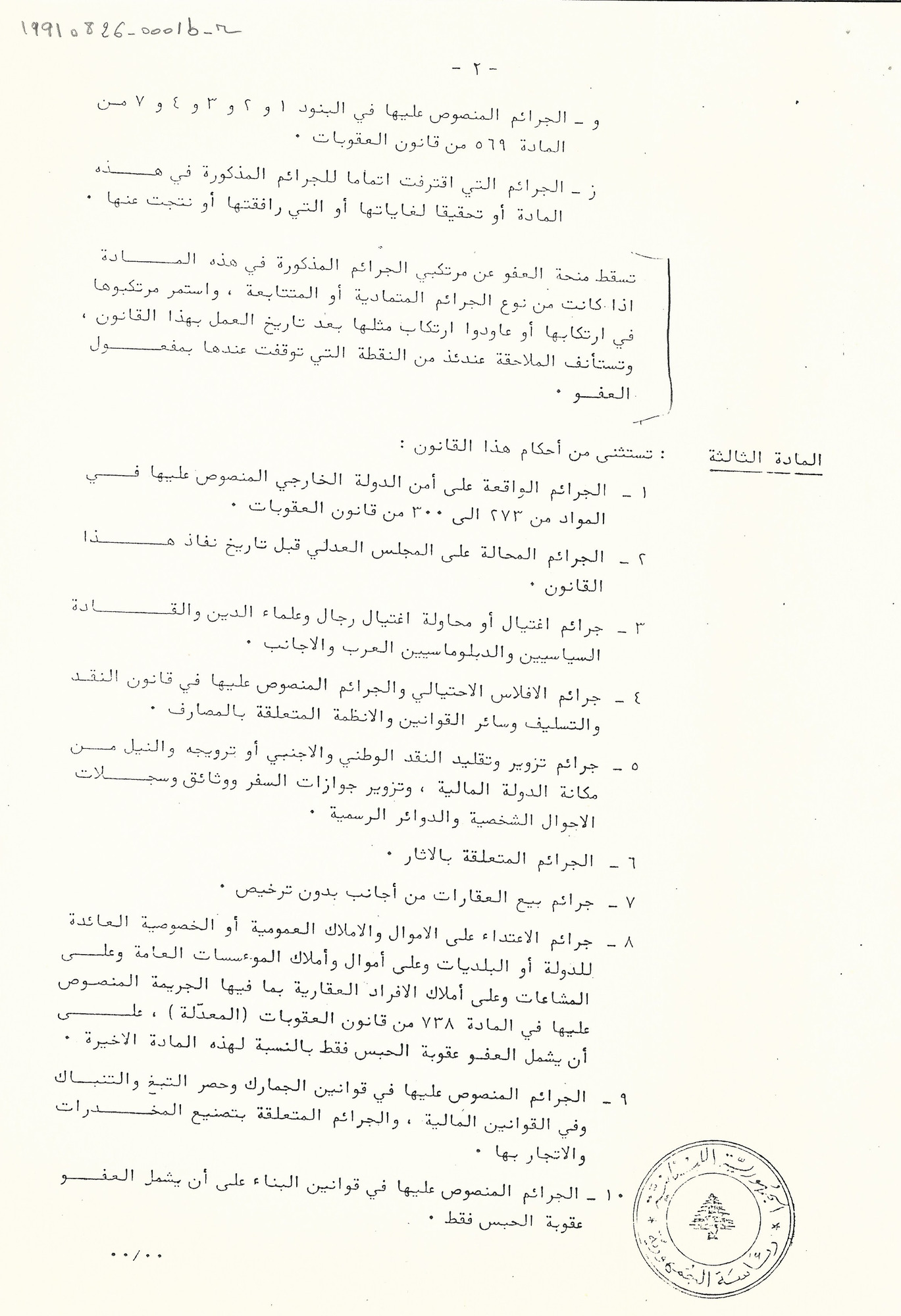 - ar قانون رقم 84 يرمي الى منح عفو عام عن الجرائم المرتكبة قبل تاريخ 28 آذار 1991 وفقا لشروط محددة