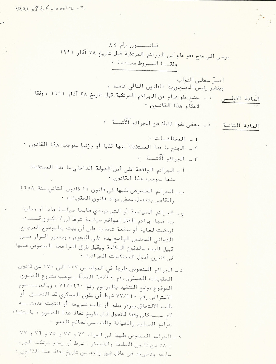 قانون رقم 84 يرمي الى منح عفو عام عن الجرائم المرتكبة قبل تاريخ 28 آذار 1991 وفقا لشروط محددة