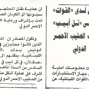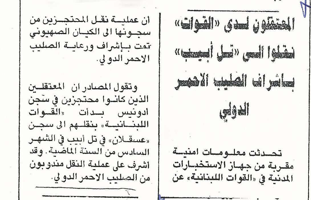 - en The detainees held by the Lebanese Forces were transferred to Tel Aviv under the supervision of the International Committee of the Red Cross.