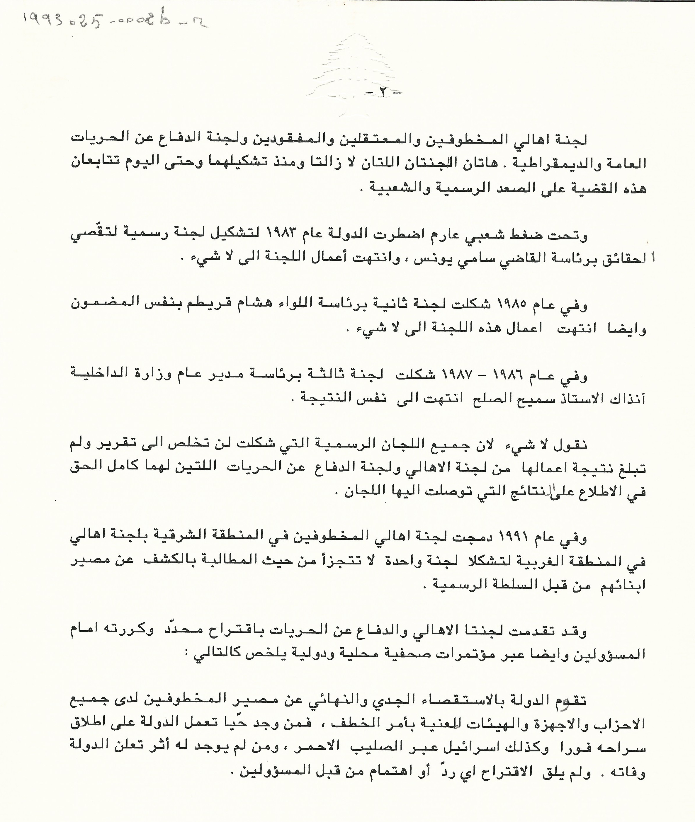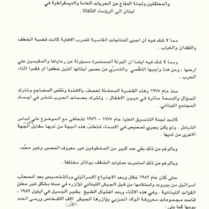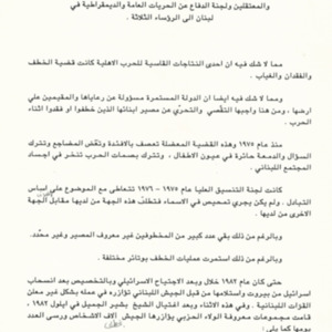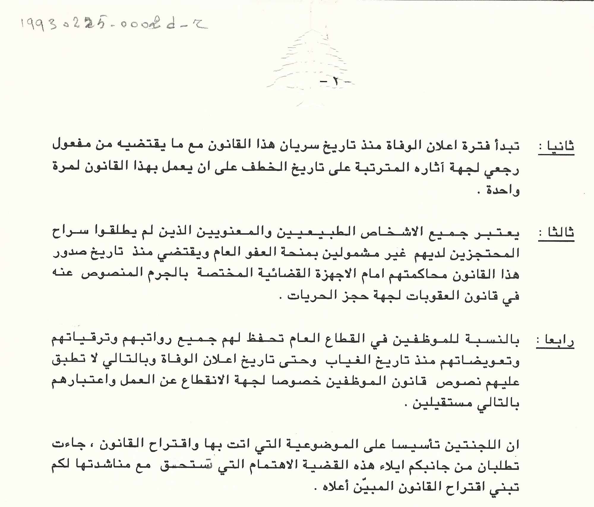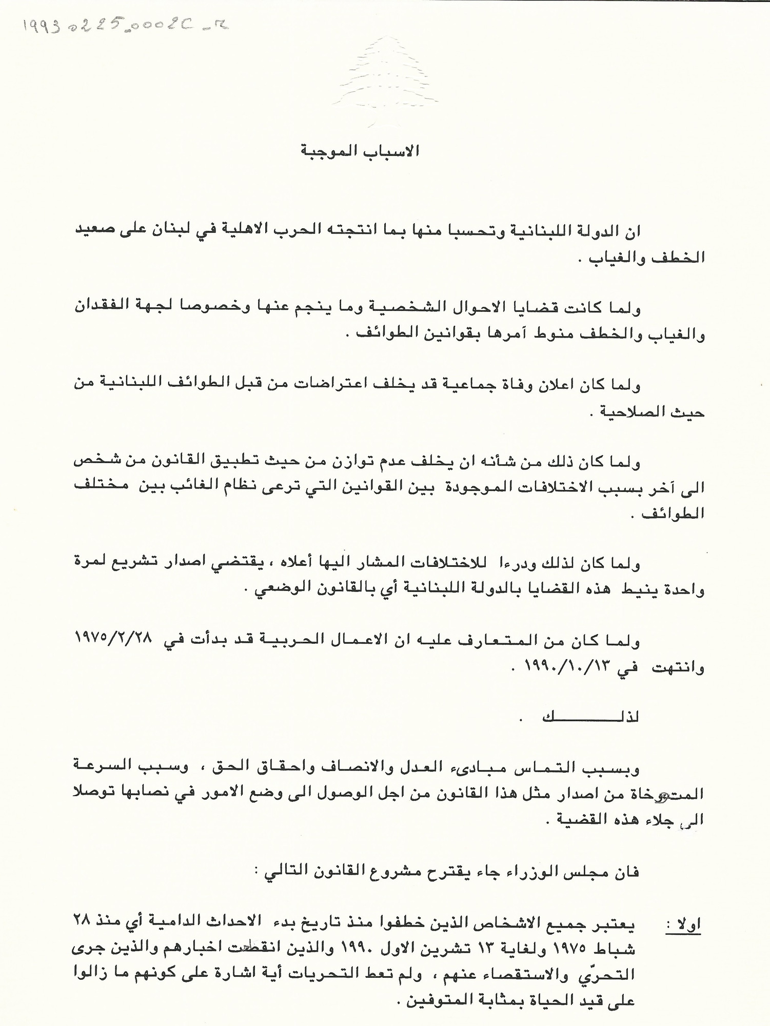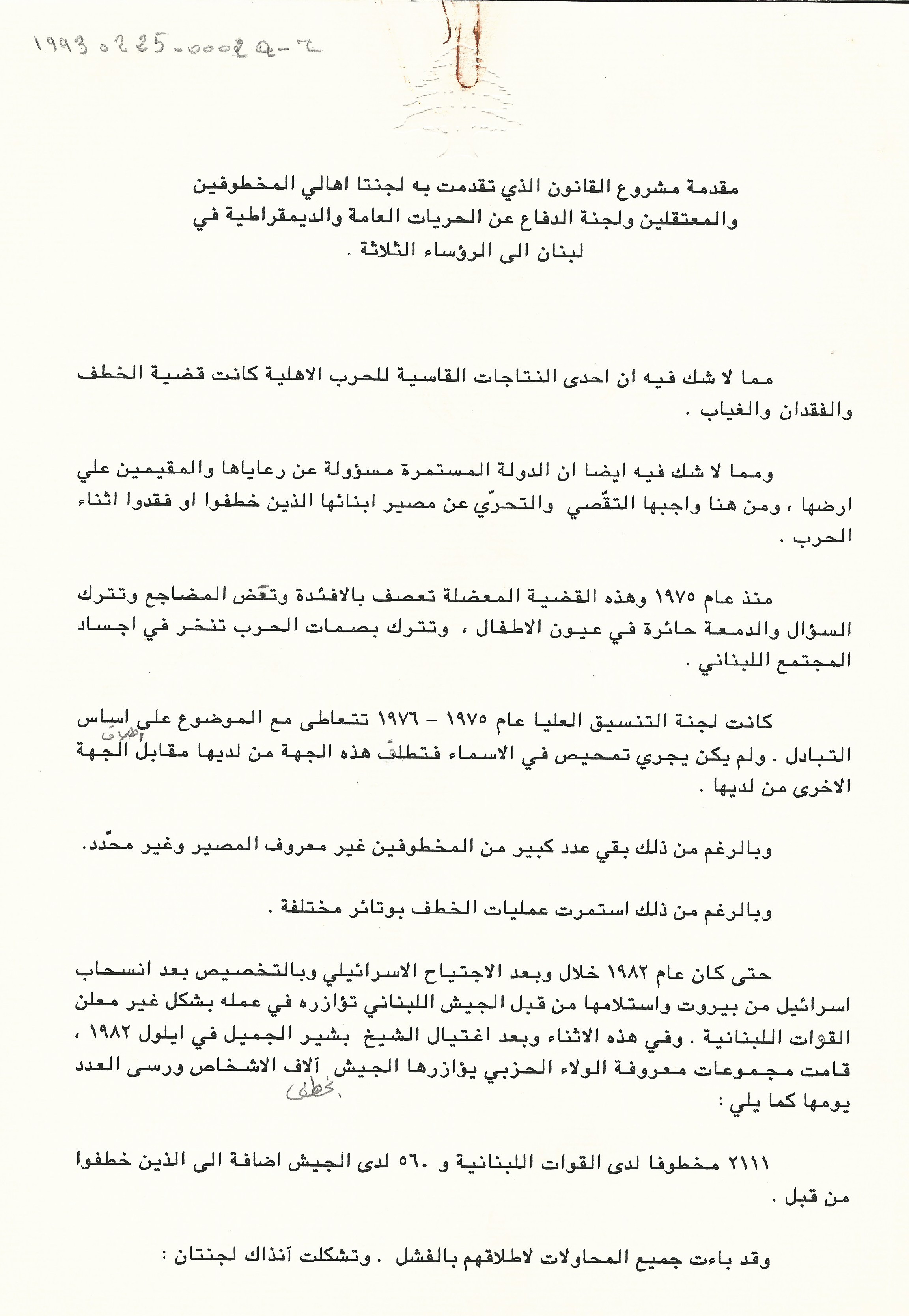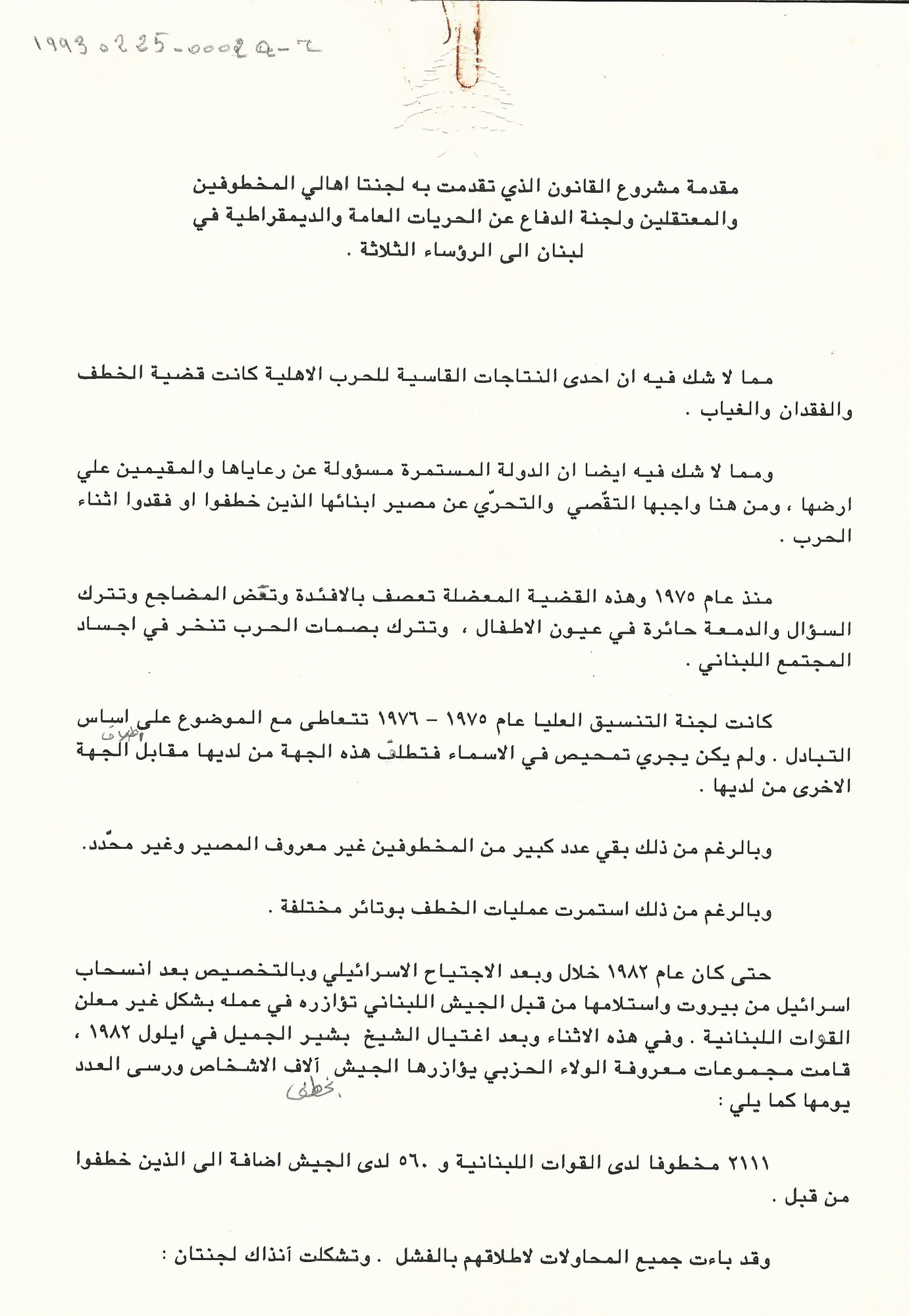 مقدمة مشروع القانون الذي تقدمت به لجنتا اهالي المخطوفين والمعتقلين ولجنة الدفاع عن الحريات العامة والديمقراطية في لبنان الى الرؤساء الثلاثة