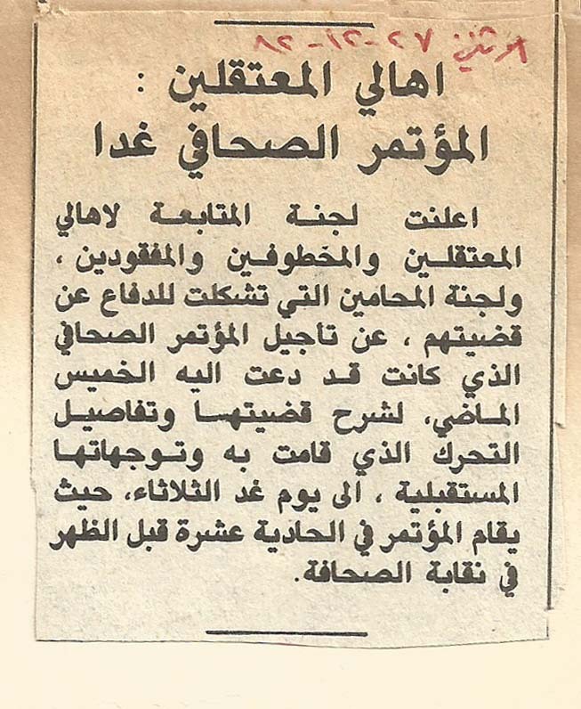 - ar أهالي المعتقلين: المؤتمر الصحافي غدا