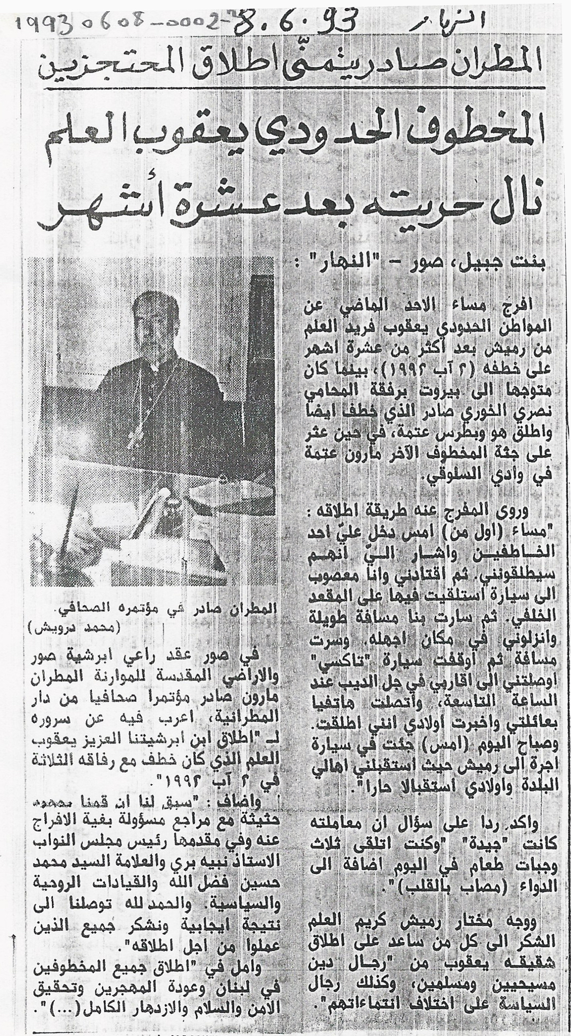 المطران صادر يتمنى اطلاق سراح المحتجزين، المخطوف الحدودي يعقوب العلم نال حريته بعد عشرة اشهر