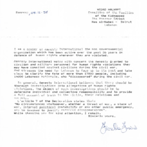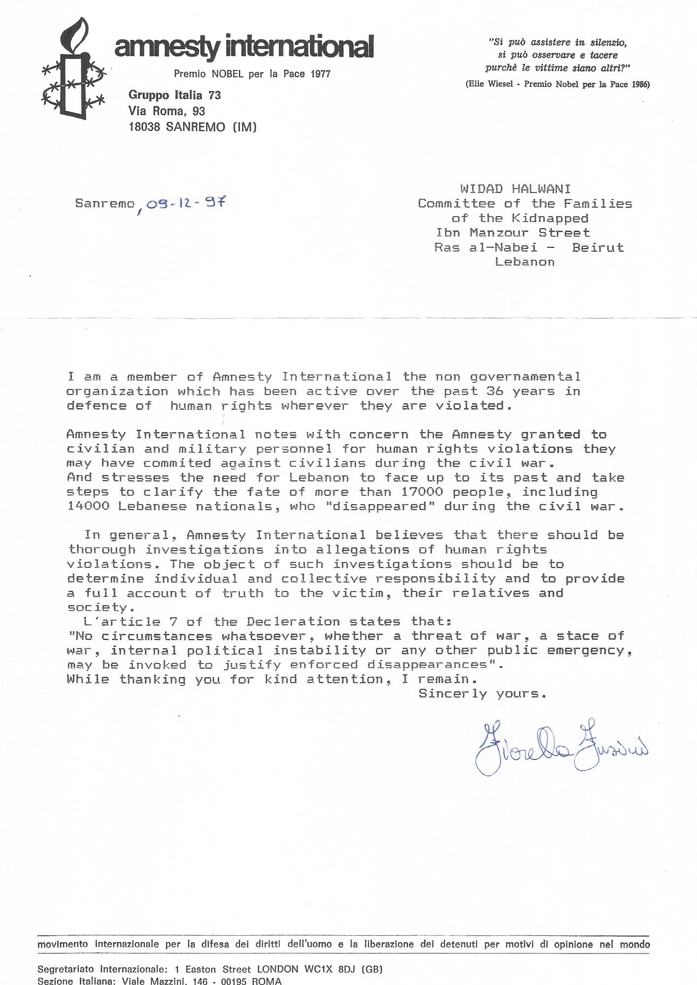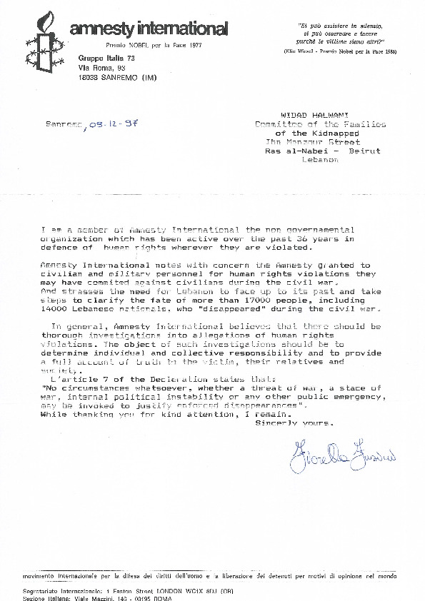Letter from Amnesty International in Italy to Wadad Halwani, condemns the violations of human rights in Lebanon