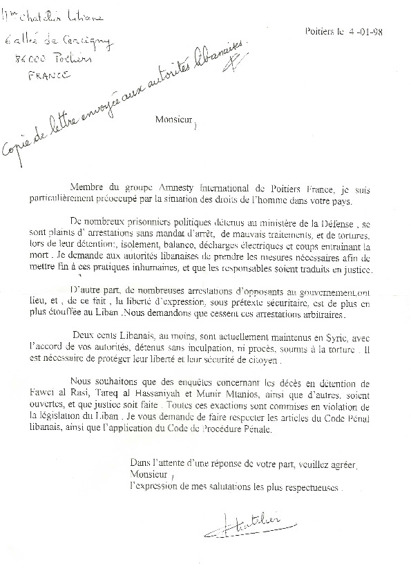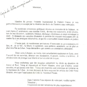 - fr Lettre d'Amnesty International en France adressé aux autorites Libanaises, Condamne les arrestations arbitraire
