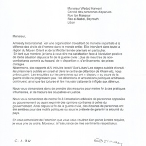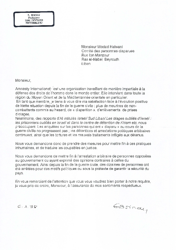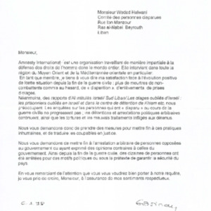 - fr Lettre d'appuit et de solidarite adressé a Wadad Halwani par l'Amnesty International en Suisse