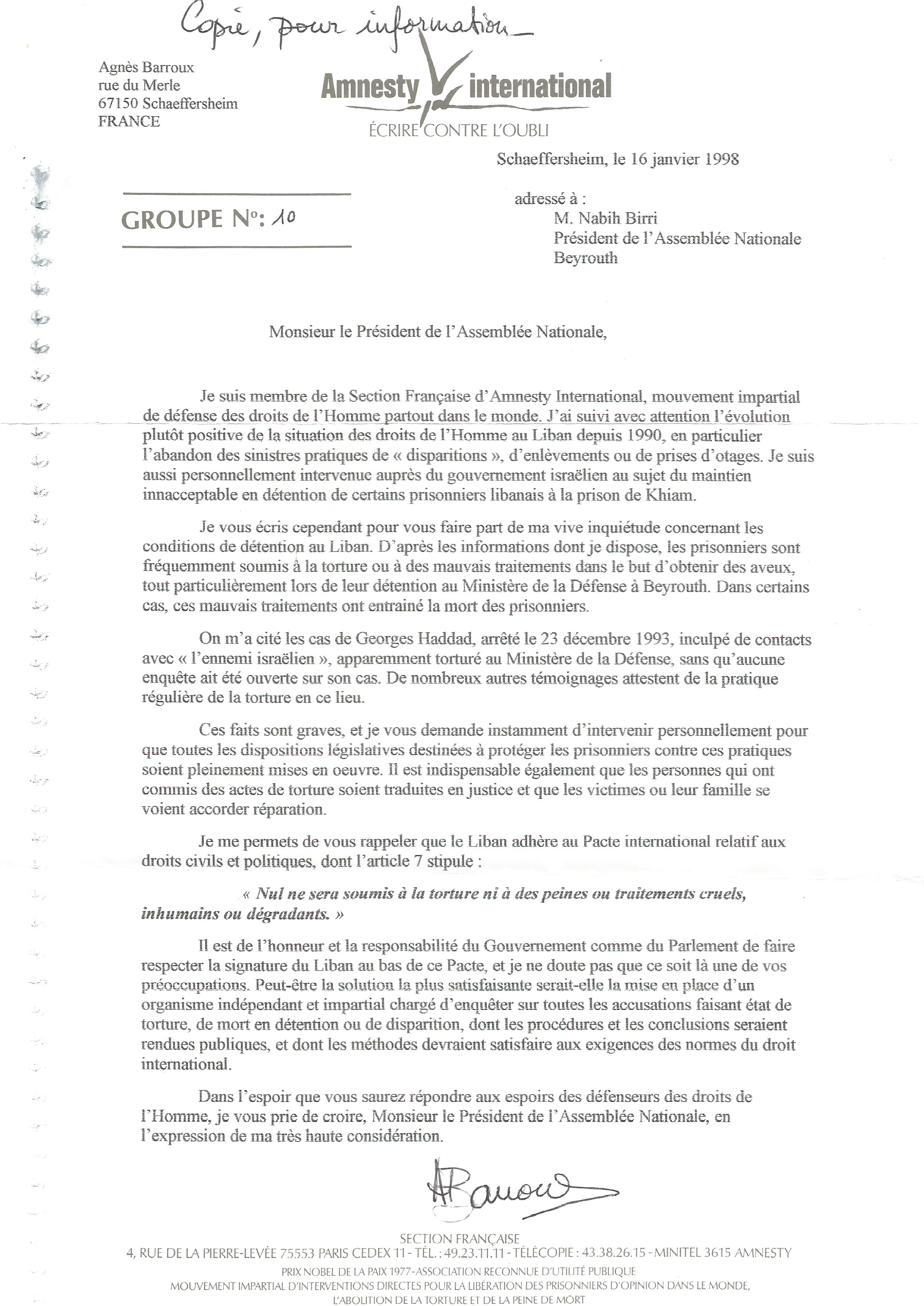 - fr Lettre d'Amnesty International France adressée a Nabih Birri concernant les conditions de détention au Liban