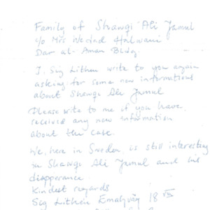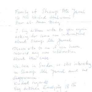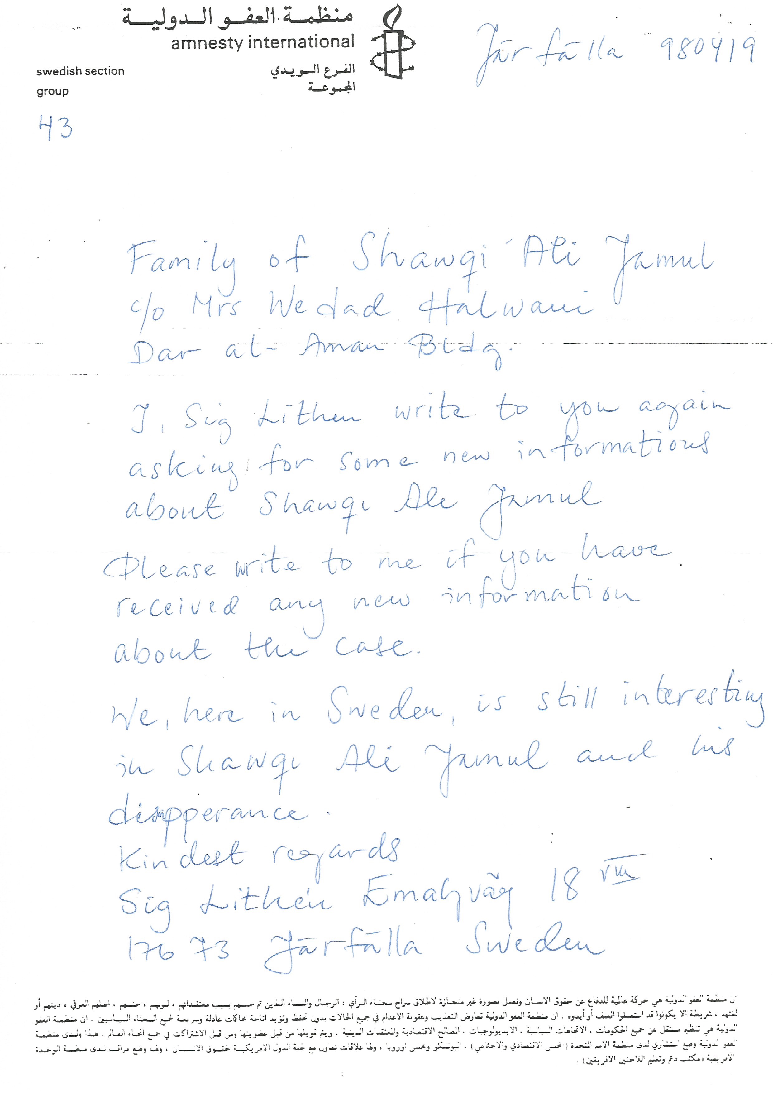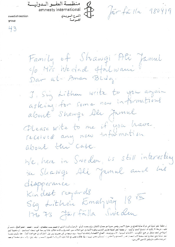 Letter from Amnesty International to Shawqi Ali Jamul family and Wadad Halwani