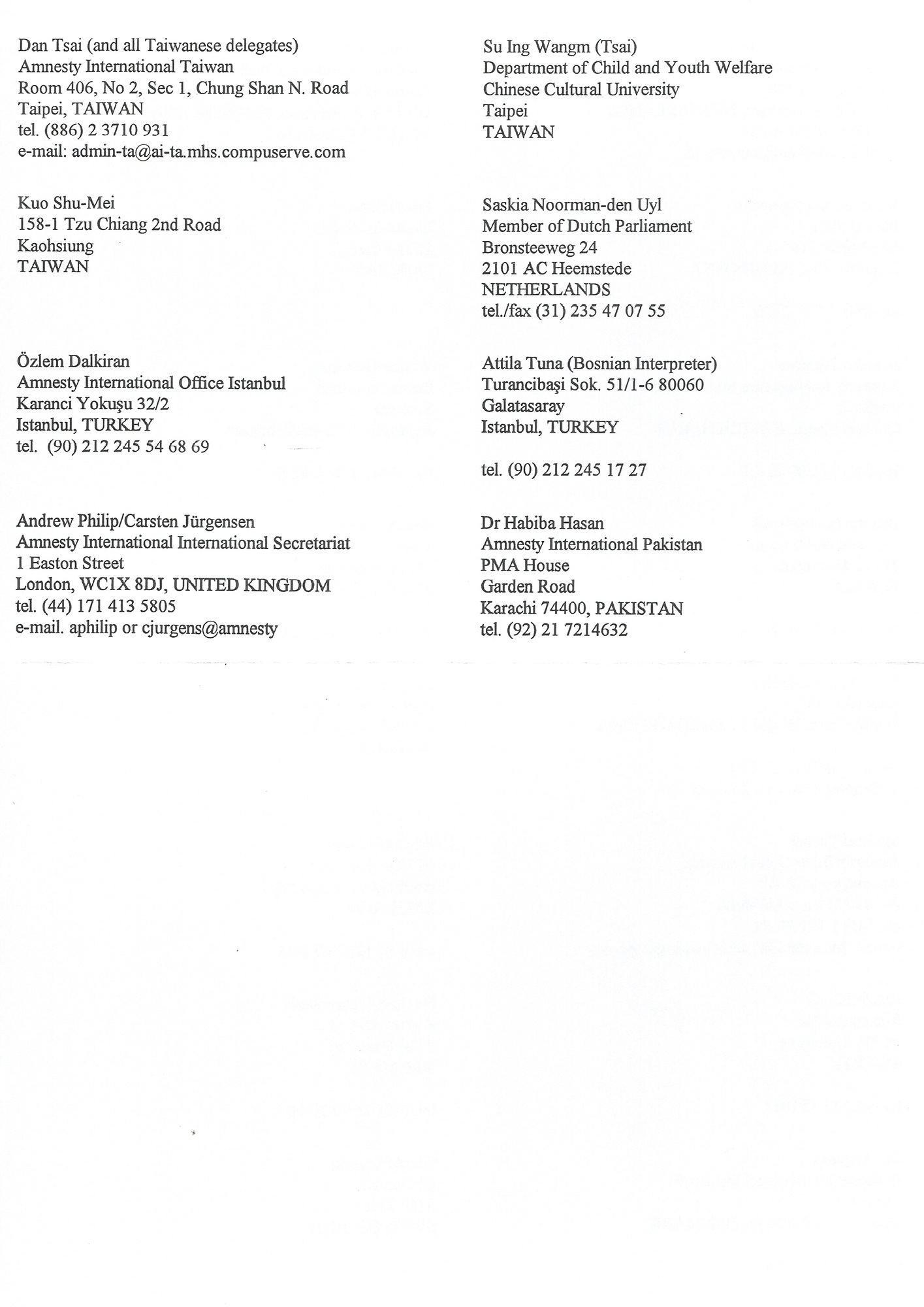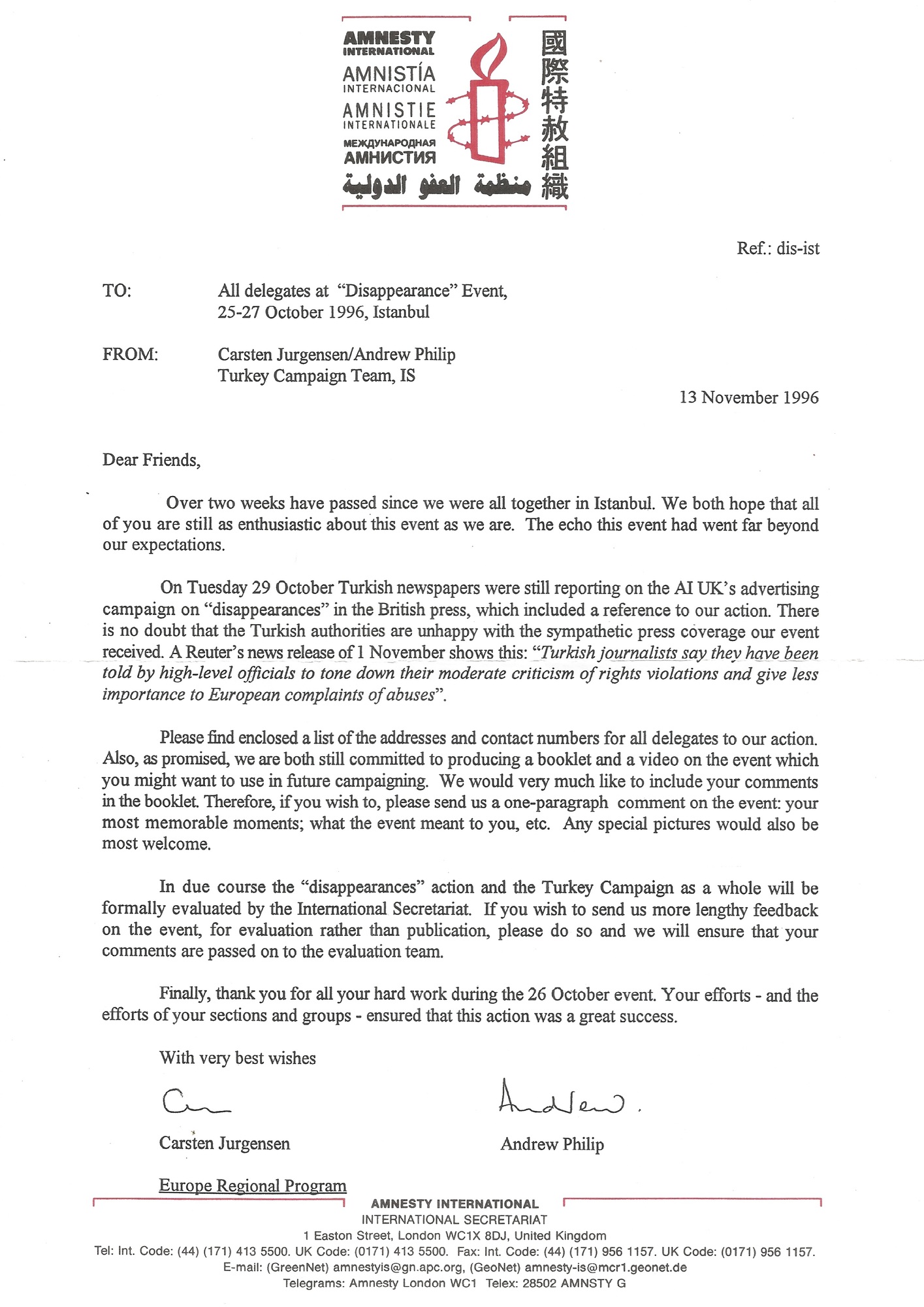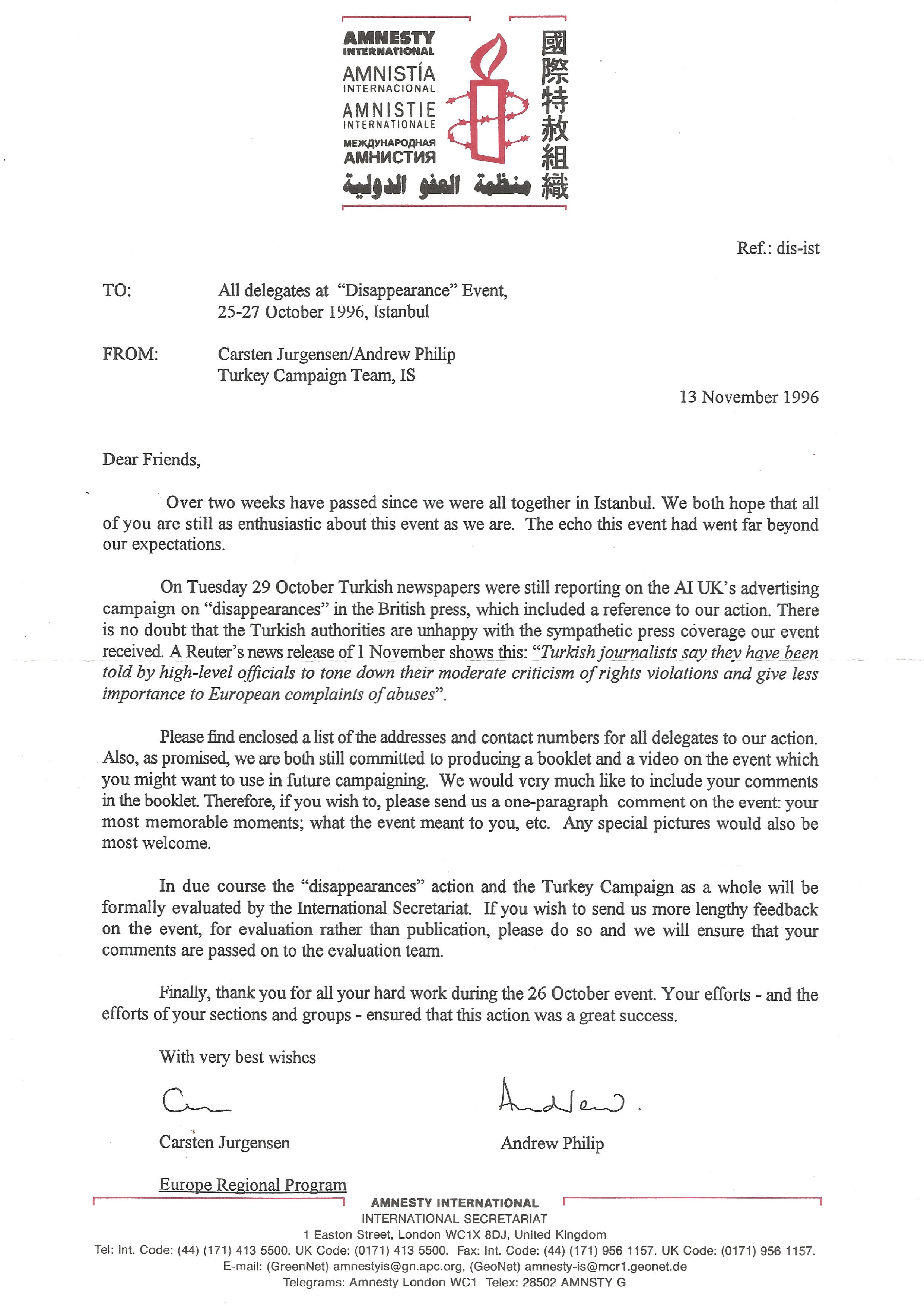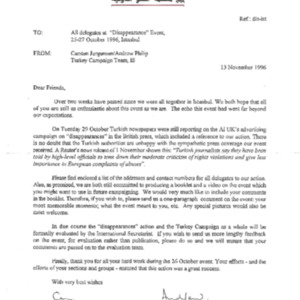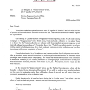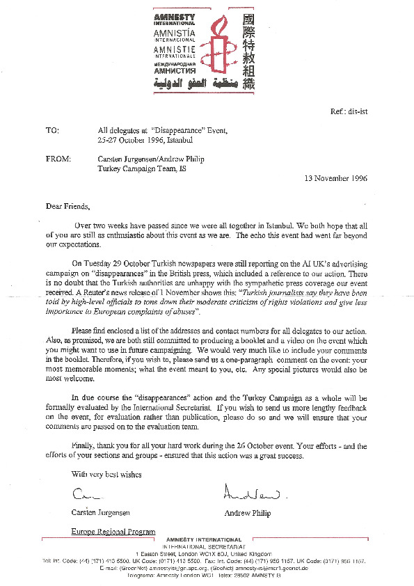 Letter from Amnesty International to the delegates at the Disappearance event held in Istanbul, 1996
