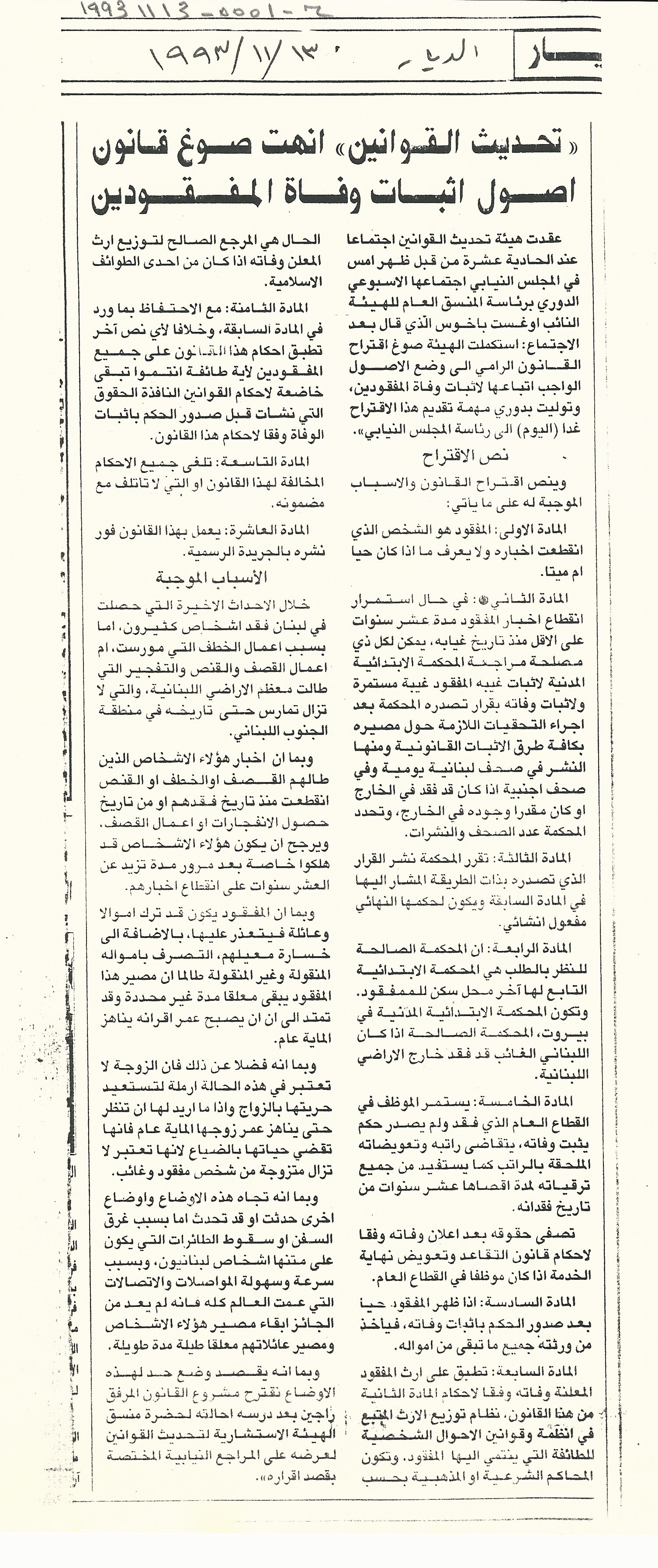 - ar تحديث القوانين انهت صوغ قانون اصول اثبات وفاة المفقودين